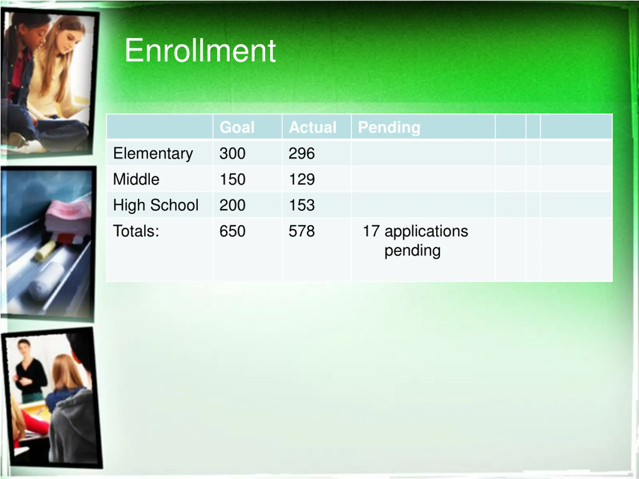 Enrollment Goal 300 150 200 650 Actual 296 129 153 578 Pending Elementary Middle High School Totals: 17 applications pending