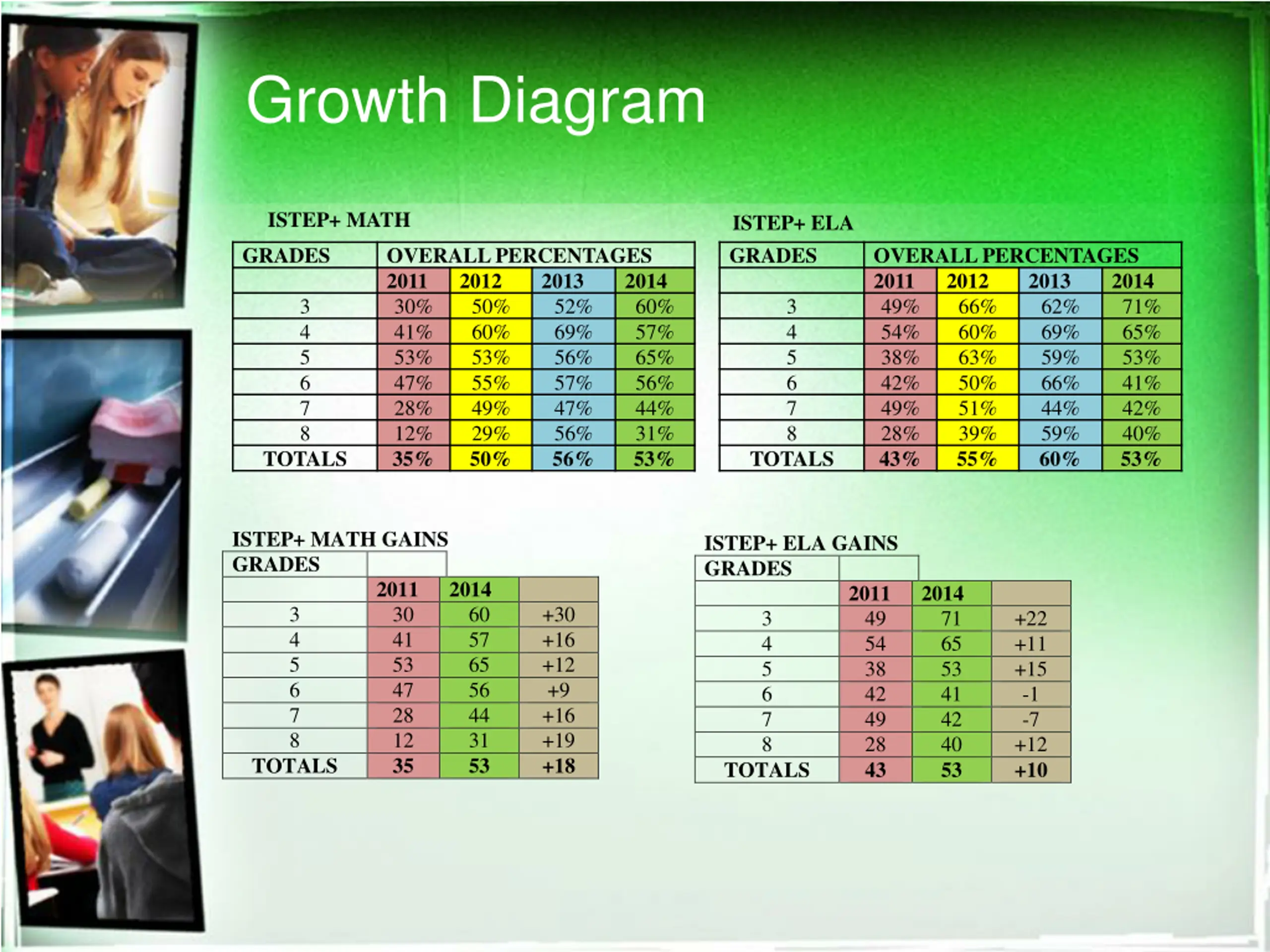 Growth Diagram ISTEP+ MATH ISTEP+ ELA GRADES OVERALL PERCENTAGES 2011 2012 30% 50% 41% 60% 53% 53% 47% 55% 28% 49% 12% 29% 35% 50% GRADES OVERALL PERCENTAGES 2011 2012 49% 66% 54% 60% 38% 63% 42% 50% 49% 51% 28% 39% 43% 55% 2013 52% 69% 56% 57% 47% 56% 56% 2014 60% 57% 65% 56% 44% 31% 53% 2013 62% 69% 59% 66% 44% 59% 60% 2014 71% 65% 53% 41% 42% 40% 53% 3 4 5 6 7 8 3 4 5 6 7 8 TOTALS TOTALS ISTEP+ MATH GAINS GRADES 3 4 5 6 7 8 TOTALS ISTEP+ ELA GAINS GRADES 3 4 5 6 7 8 TOTALS 2011 30 41 53 47 28 12 35 2011 49 54 38 42 49 28 43 2014 60 57 65 56 44 31 53 2014 71 65 53 41 42 40 53 +30 +16 +12 +9 +16 +19 +18 +22 +11 +15 -1 -7 +12 +10