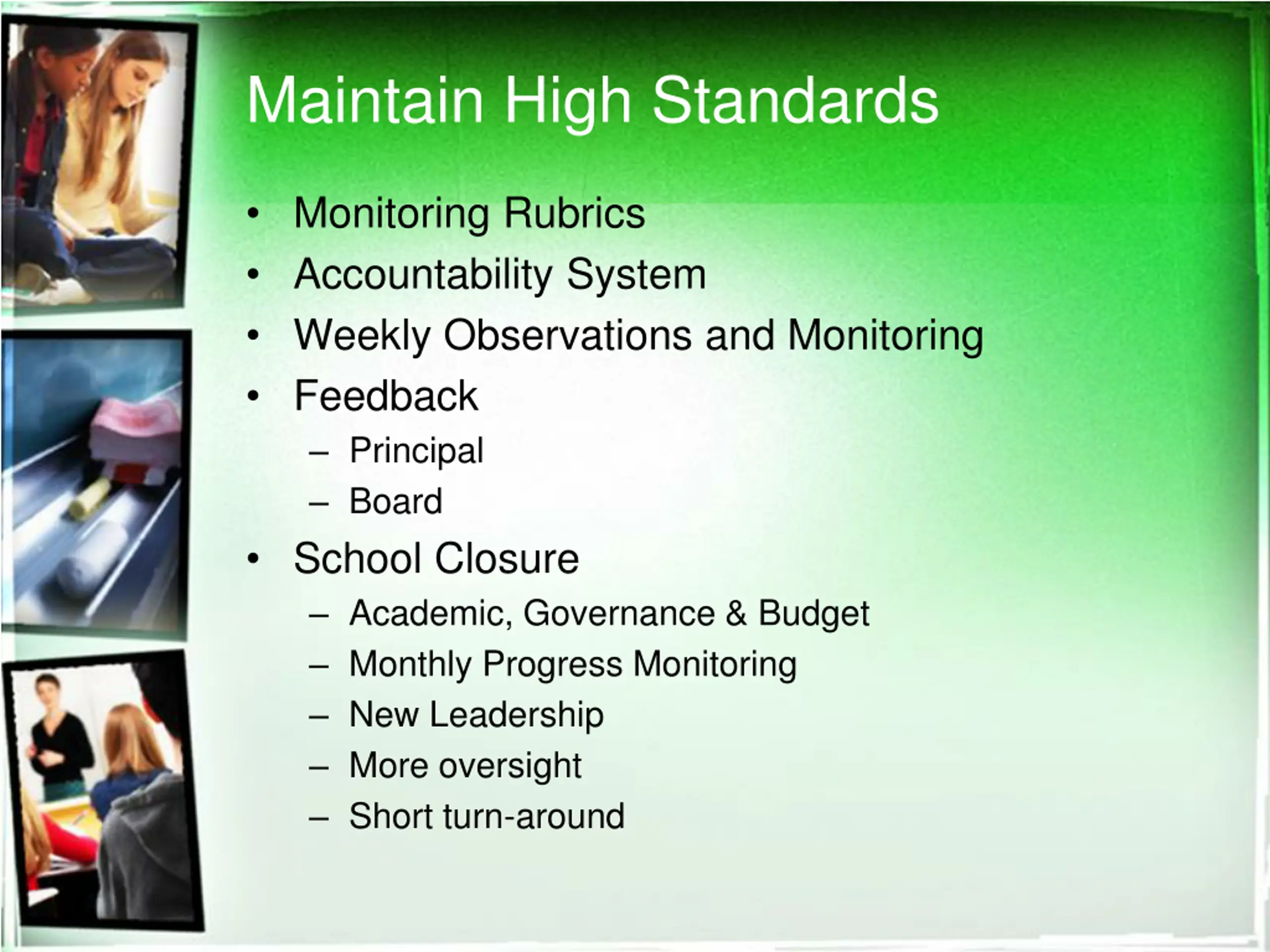 Maintain High Standards Monitoring Rubrics Accountability System Weekly Observations and Monitoring Feedback Principal Board School Closure Academic, Governance & Budget Monthly Progress Monitoring New Leadership More oversight Short turn-around