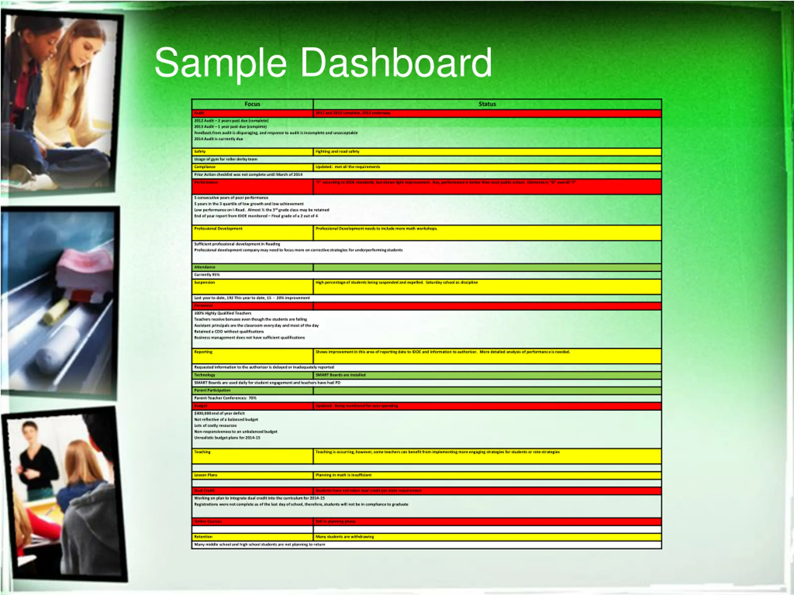 Sample Dashboard Focus Status Audit 2011 and 2012 complete, 2013 underway 2012 Audit 2 years past due (complete) 2013 Audit 1 year past due (complete) Feedback from audit is disparaging, and response to audit is incomplete and unacceptable 2014 Audit is currently due Safety Fighting and road safety Usage of gym for roller derby team Compliance Updated: met all the requirements Prior Action checklist was not complete until March of 2014 Performance F according to IDOE standards, but shows light improvement. But, performance is better than local public school. Elementary D overall F 5 consecutive years of poor performance 5 years in the 3 quartile of low growth and low achievement Low performance on I-Read. Almost the 3rdgrade class may be retained End of year report from IDOE monitored Final grade of a 2 out of 4 Professional Development Professional Development needs to include more math workshops. Sufficient professional development in Reading Professional development company may need to focus more on corrective strategies for underperforming students Attendance Currently 95% Suspension High percentage of students being suspended and expelled. Saturday school as discipline Last year to date, 192 This year to date, 15 - 20% improvement Personnel 100% Highly Qualified Teachers Teachers receive bonuses even though the students are failing Assistant principals are the classroom every day and most of the day Retained a COO without qualifications Business management does not have sufficient qualifications Reporting Shows improvement in this area of reporting data to IDOE and information to authorizer. More detailed analysis of performance is needed. Requested information to the authorizer is delayed or inadequately reported Technology SMART Boards are installed SMART Boards are used daily for student engagement and teachers have had PD Parent Participation Parent-Teacher Conferences: 70% Budget Updated: Being monitored for over spending $300,000 end of year deficit Not reflective of a balanced budget Lots of costly resources Non-responsiveness to an unbalanced budget Unrealistic budget plans for 2014-15 Teaching Teaching is occurring, however, some teachers can benefit from implementing more engaging strategies for students or rote strategies Lesson Plans Planning in math is insufficient Dual Credit Students have not taken dual credit per state requirement Working on plan to integrate dual credit into the curriculum for 2014-15 Registrations were not complete as of the last day of school, therefore, students will not be in compliance to graduate Online Courses Still in planning phase Retention Many students are withdrawing Many middle school and high school students are not planning to return