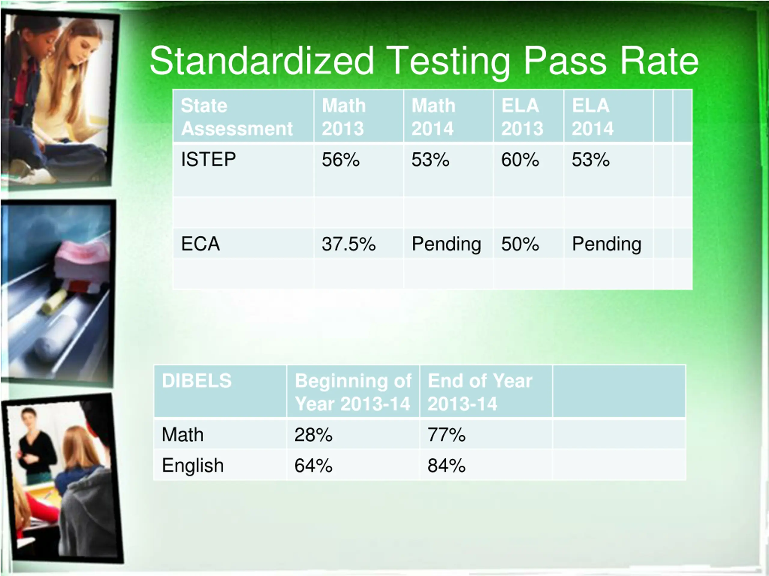 Standardized Testing Pass Rate State Assessment ISTEP Math 2013 56% Math 2014 53% ELA 2013 60% ELA 2014 53% ECA 37.5% Pending 50% Pending DIBELS Beginning of Year 2013-14 28% 64% End of Year 2013-14 77% 84% Math English