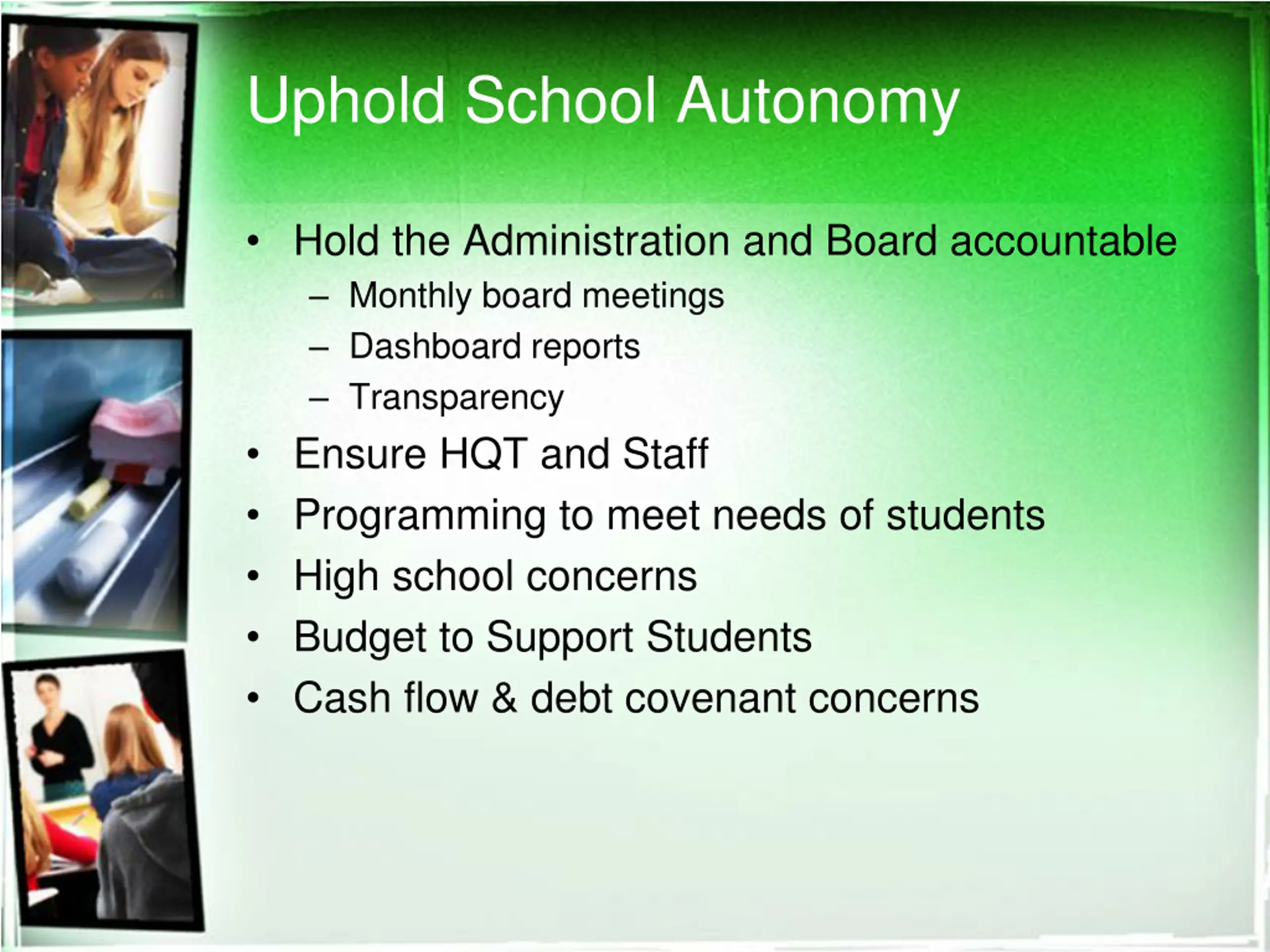 Uphold School Autonomy Hold the Administration and Board accountable Monthly board meetings Dashboard reports Transparency Ensure HQT and Staff Programming to meet needs of students High school concerns Budget to Support Students Cash flow & debt covenant concerns