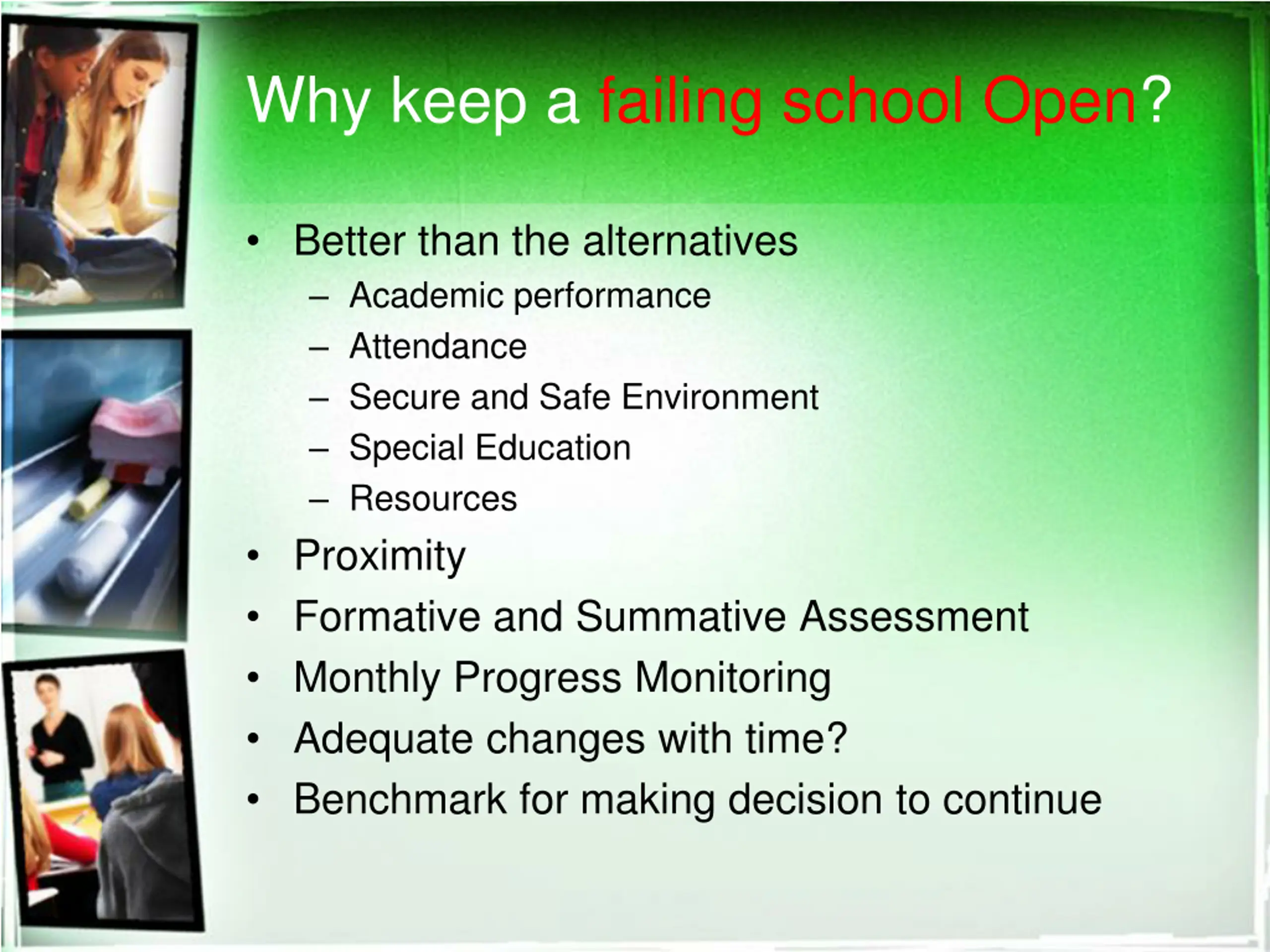 Why keep a failing school Open? Better than the alternatives Academic performance Attendance Secure and Safe Environment Special Education Resources Proximity Formative and Summative Assessment Monthly Progress Monitoring Adequate changes with time? Benchmark for making decision to continue