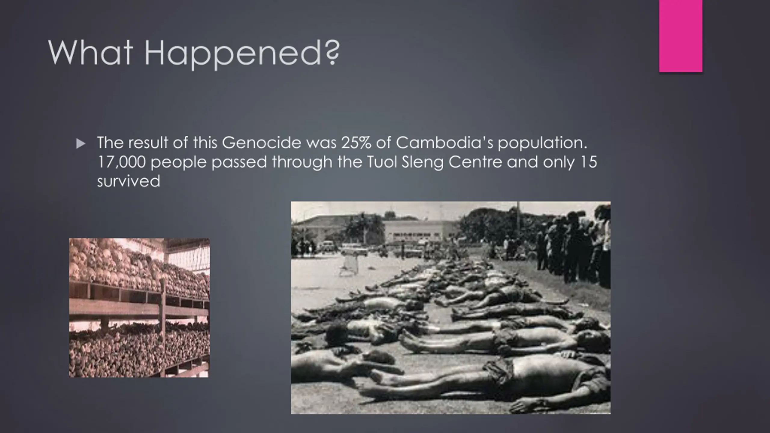 What Happened? The result of this Genocide was 25% of Cambodia s population. 17,000 people passed through the Tuol Sleng Centre and only 15 survived