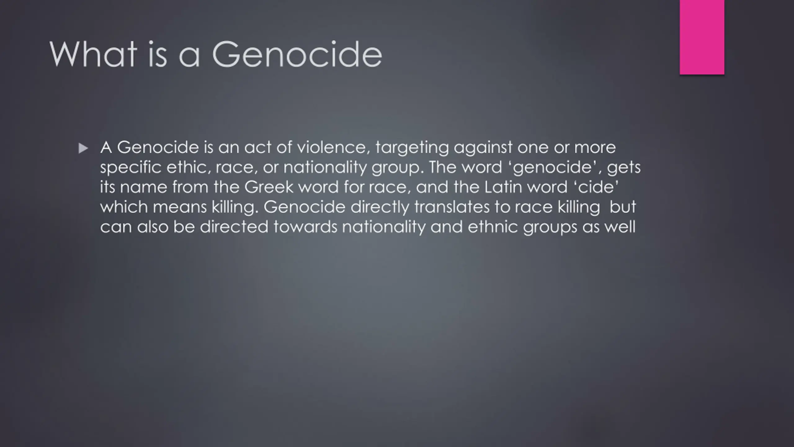 What is a Genocide A Genocide is an act of violence, targeting against one or more specific ethic, race, or nationality group. The word genocide , gets its name from the Greek word for race, and the Latin word cide which means killing. Genocide directly translates to race killing but can also be directed towards nationality and ethnic groups as well