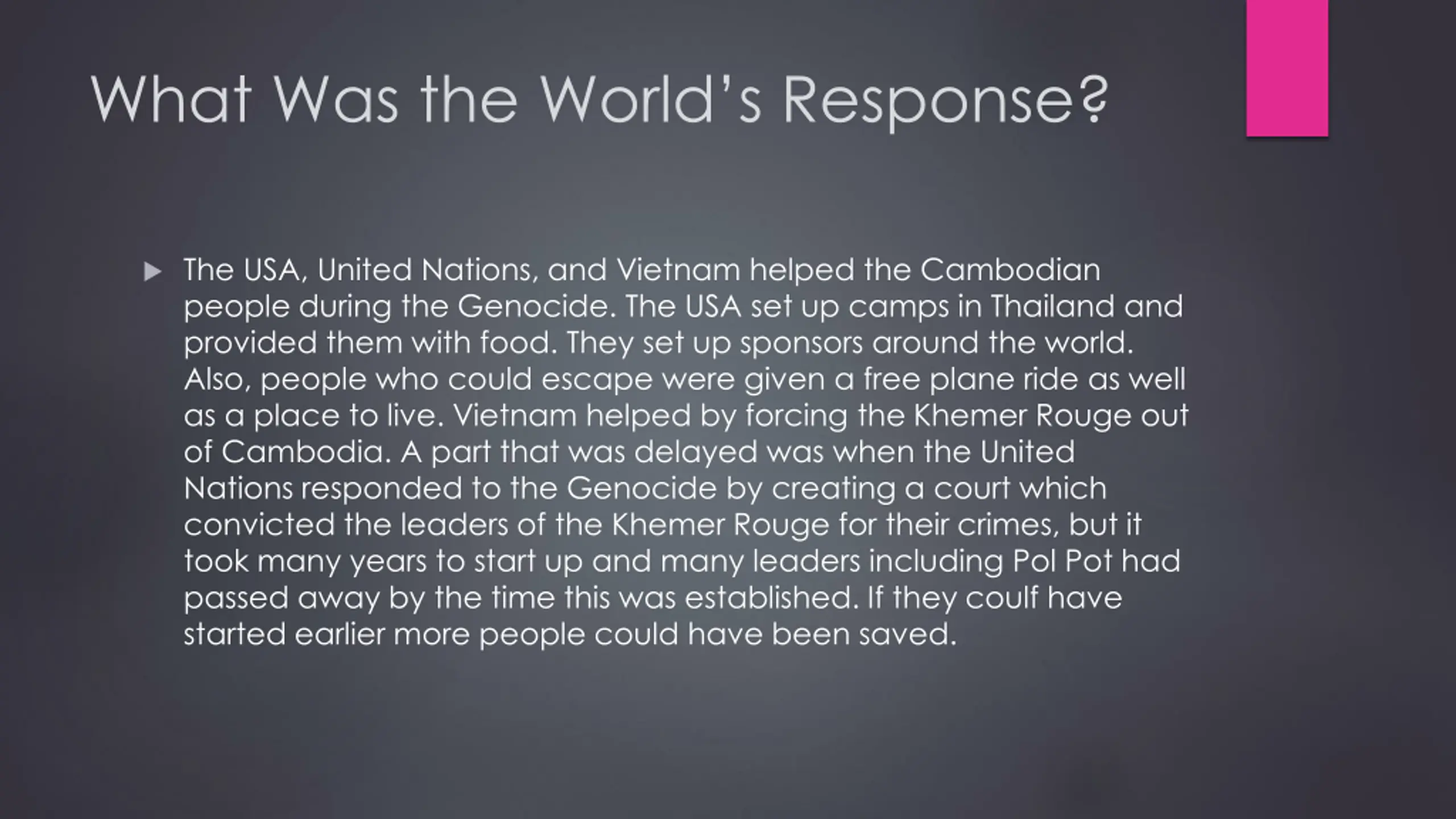 What Was the Worlds Response? The USA, United Nations, and Vietnam helped the Cambodian people during the Genocide. The USA set up camps in Thailand and provided them with food. They set up sponsors around the world. Also, people who could escape were given a free plane ride as well as a place to live. Vietnam helped by forcing the Khemer Rouge out of Cambodia. A part that was delayed was when the United Nations responded to the Genocide by creating a court which convicted the leaders of the Khemer Rouge for their crimes, but it took many years to start up and many leaders including Pol Pot had passed away by the time this was established. If they coulf have started earlier more people could have been saved.