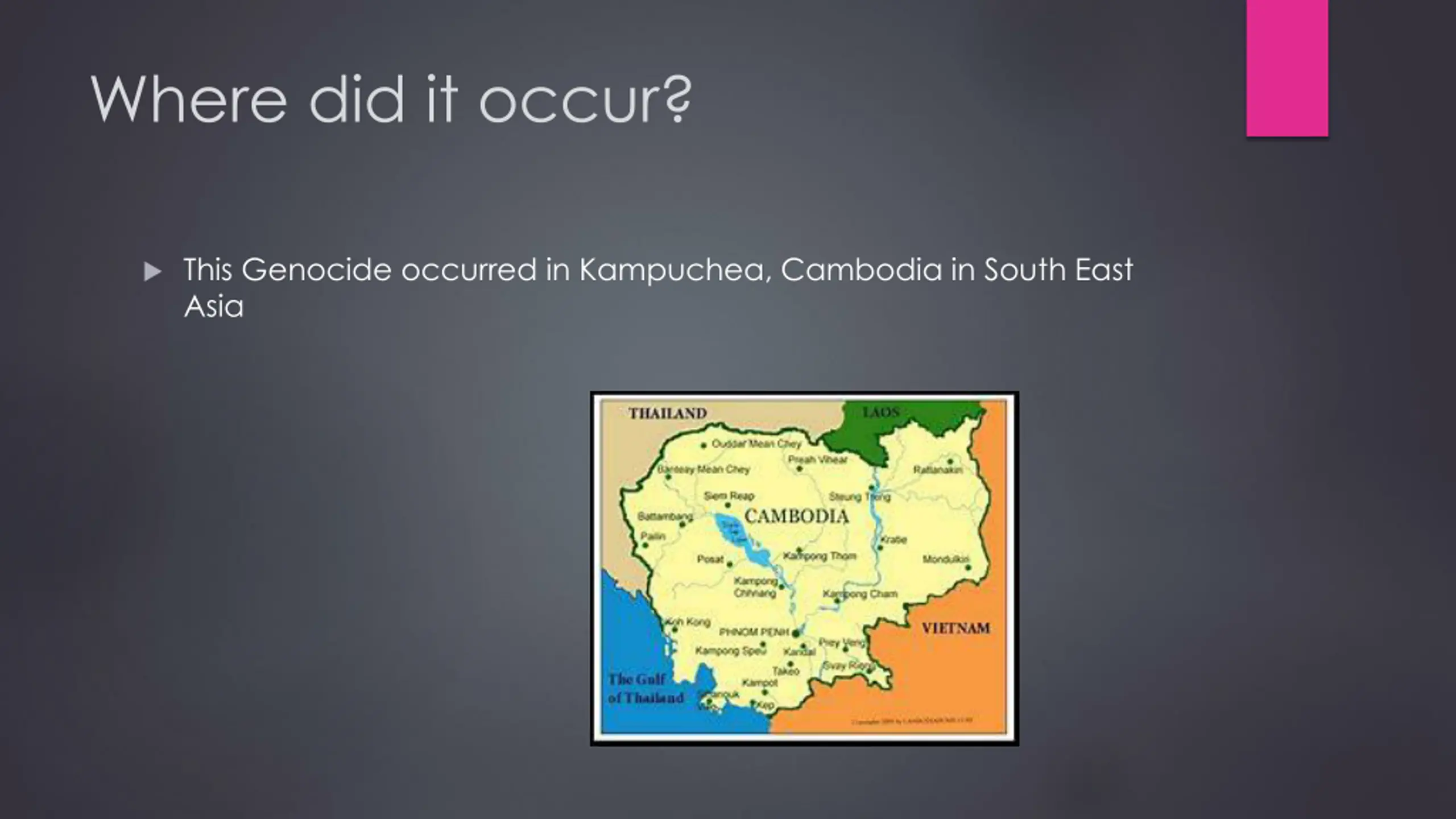 Where did it occur? This Genocide occurred in Kampuchea, Cambodia in South East Asia