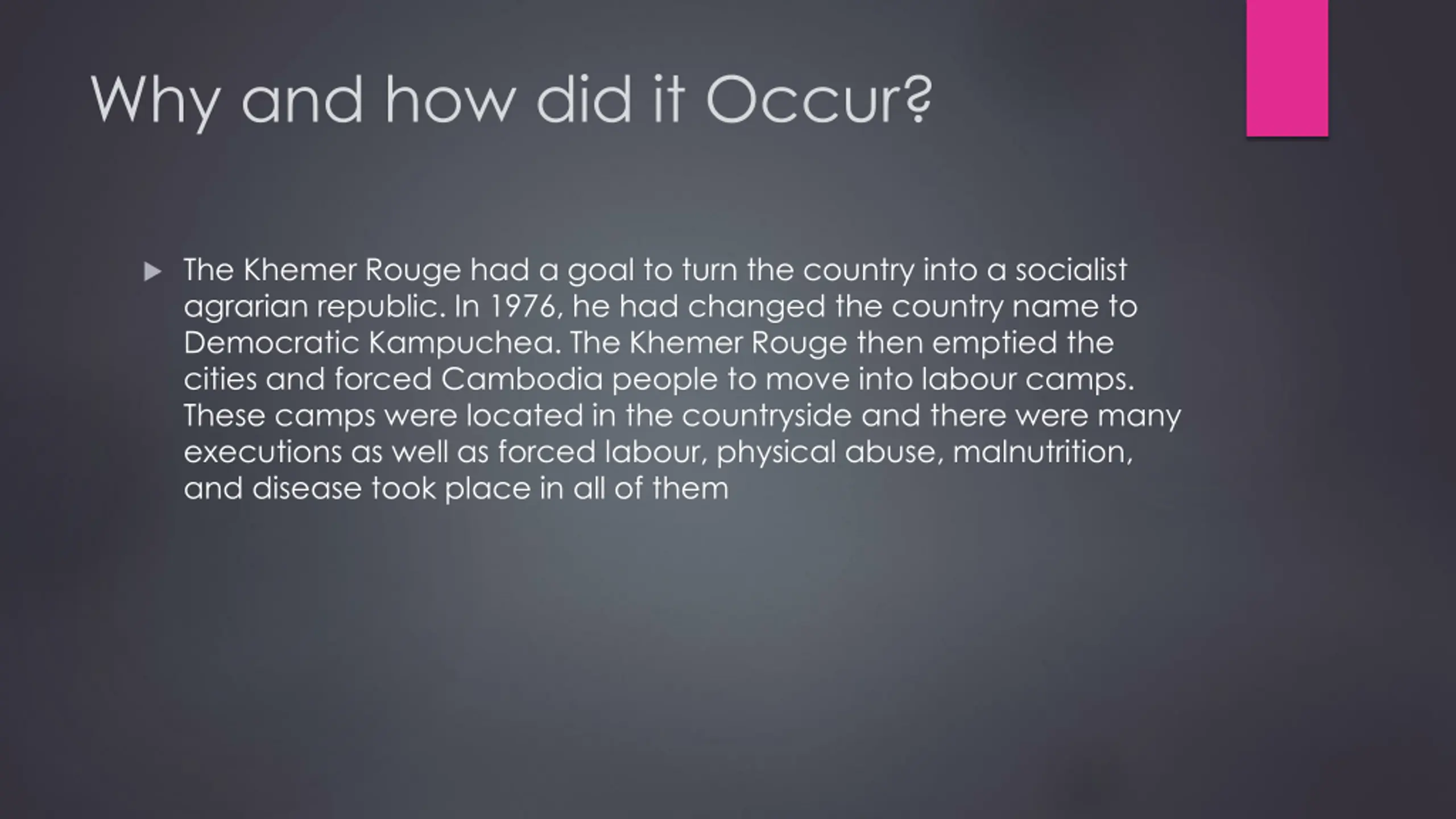 Why and how did it Occur? The Khemer Rouge had a goal to turn the country into a socialist agrarian republic. In 1976, he had changed the country name to Democratic Kampuchea. The Khemer Rouge then emptied the cities and forced Cambodia people to move into labour camps. These camps were located in the countryside and there were many executions as well as forced labour, physical abuse, malnutrition, and disease took place in all of them