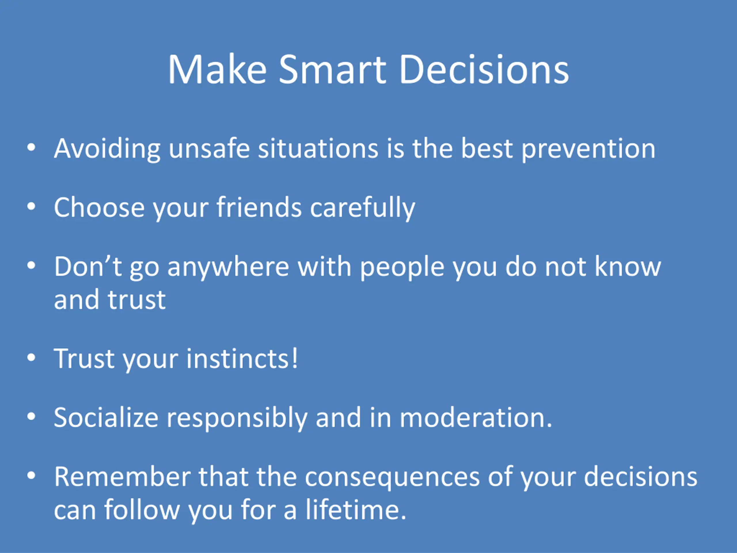 Make Smart Decisions Avoiding unsafe situations is the best prevention Choose your friends carefully Don t go anywhere with people you do not know and trust Trust your instincts! Socialize responsibly and in moderation. Remember that the consequences of your decisions can follow you for a lifetime.