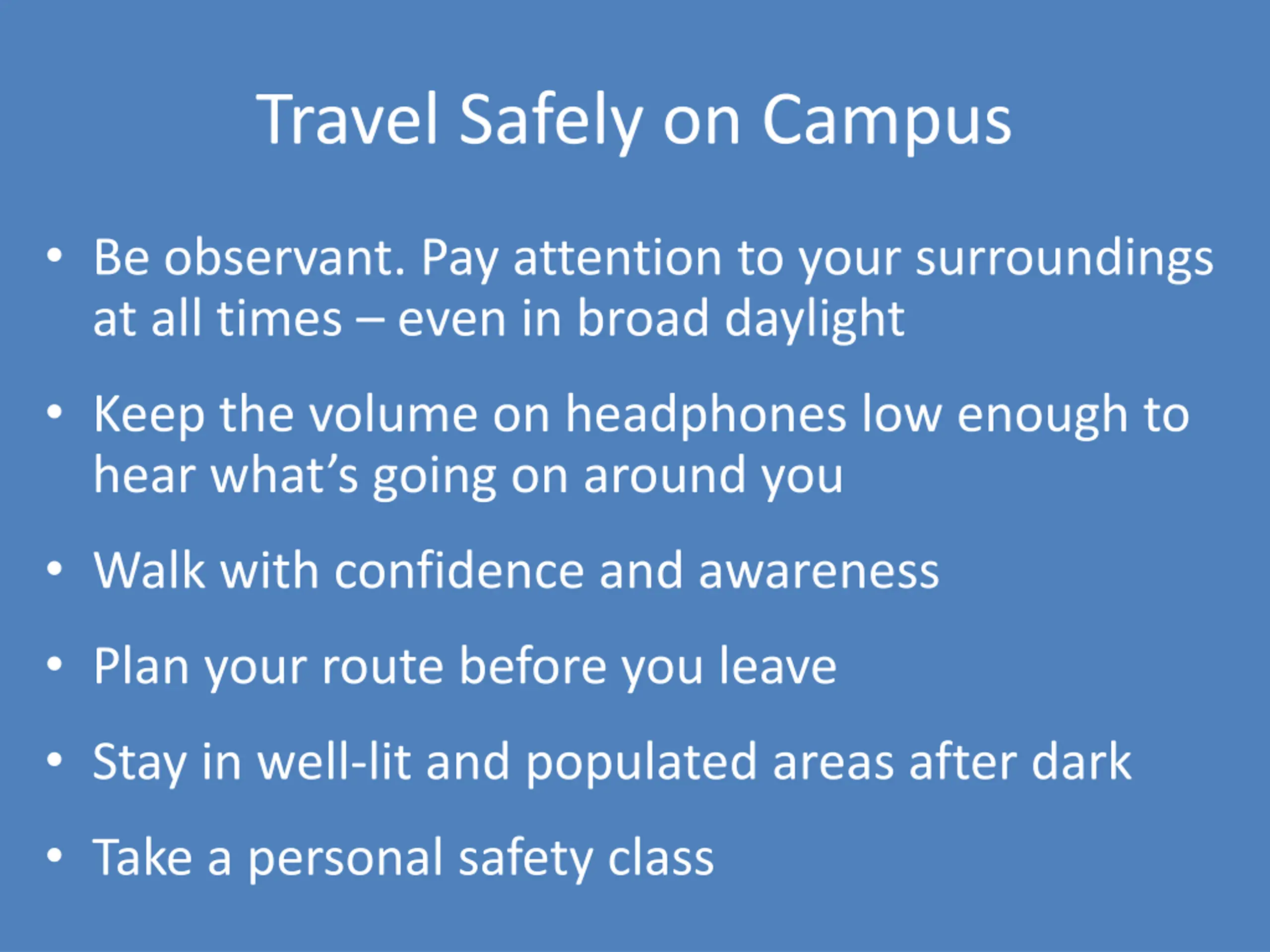 Travel Safely on Campus Be observant. Pay attention to your surroundings at all times even in broad daylight Keep the volume on headphones low enough to hear what s going on around you Walk with confidence and awareness Plan your route before you leave Stay in well-lit and populated areas after dark Take a personal safety class