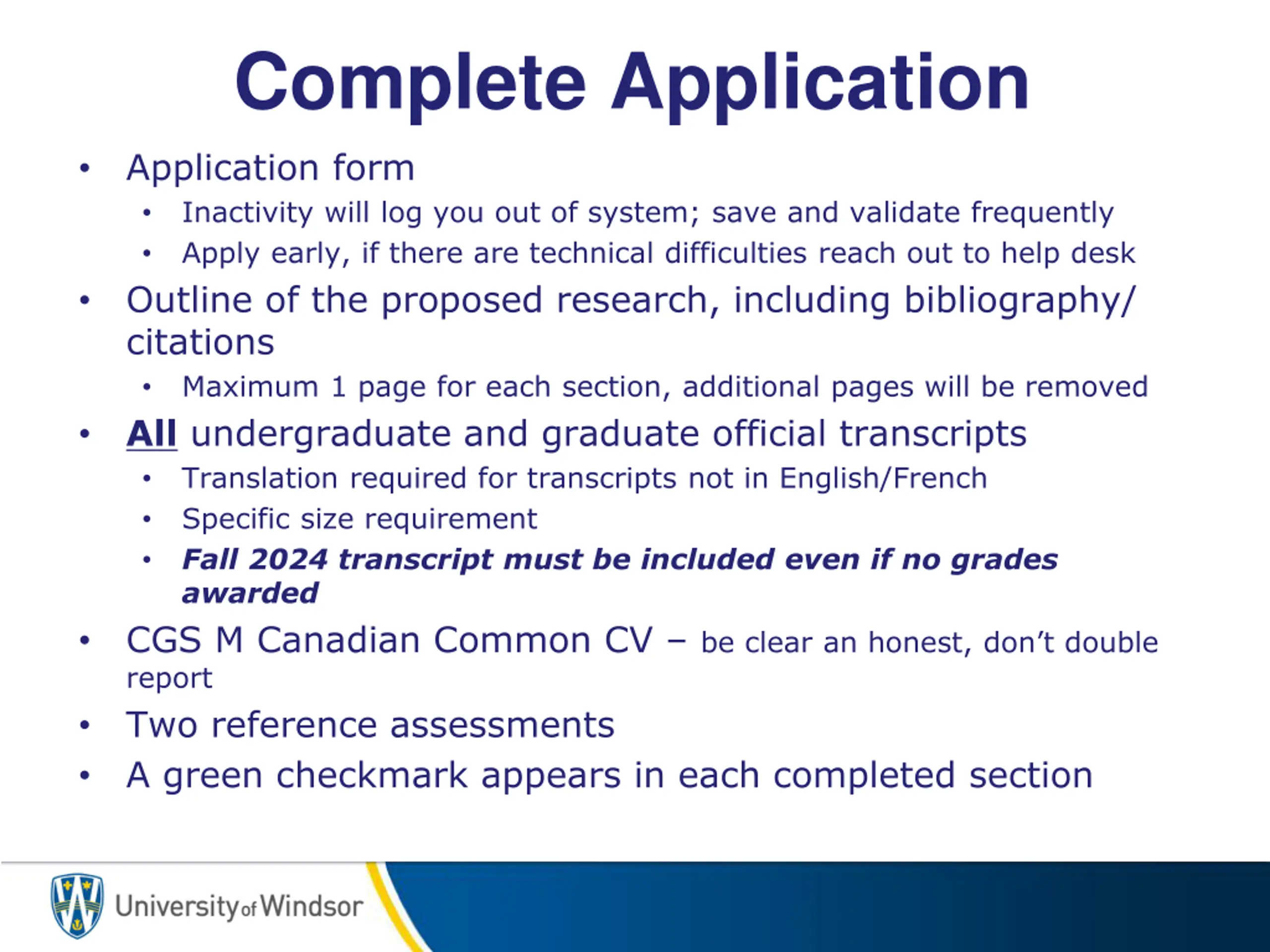 Complete Application Application form Inactivity will log you out of system; save and validate frequently Apply early, if there are technical difficulties reach out to help desk Outline of the proposed research, including bibliography/ citations Maximum 1 page for each section, additional pages will be removed All undergraduate and graduate official transcripts Translation required for transcripts not in English/French Specific size requirement Fall 2024 transcript must be included even if no grades awarded CGS M Canadian Common CV be clear an honest, don t double report Two reference assessments A green checkmark appears in each completed section