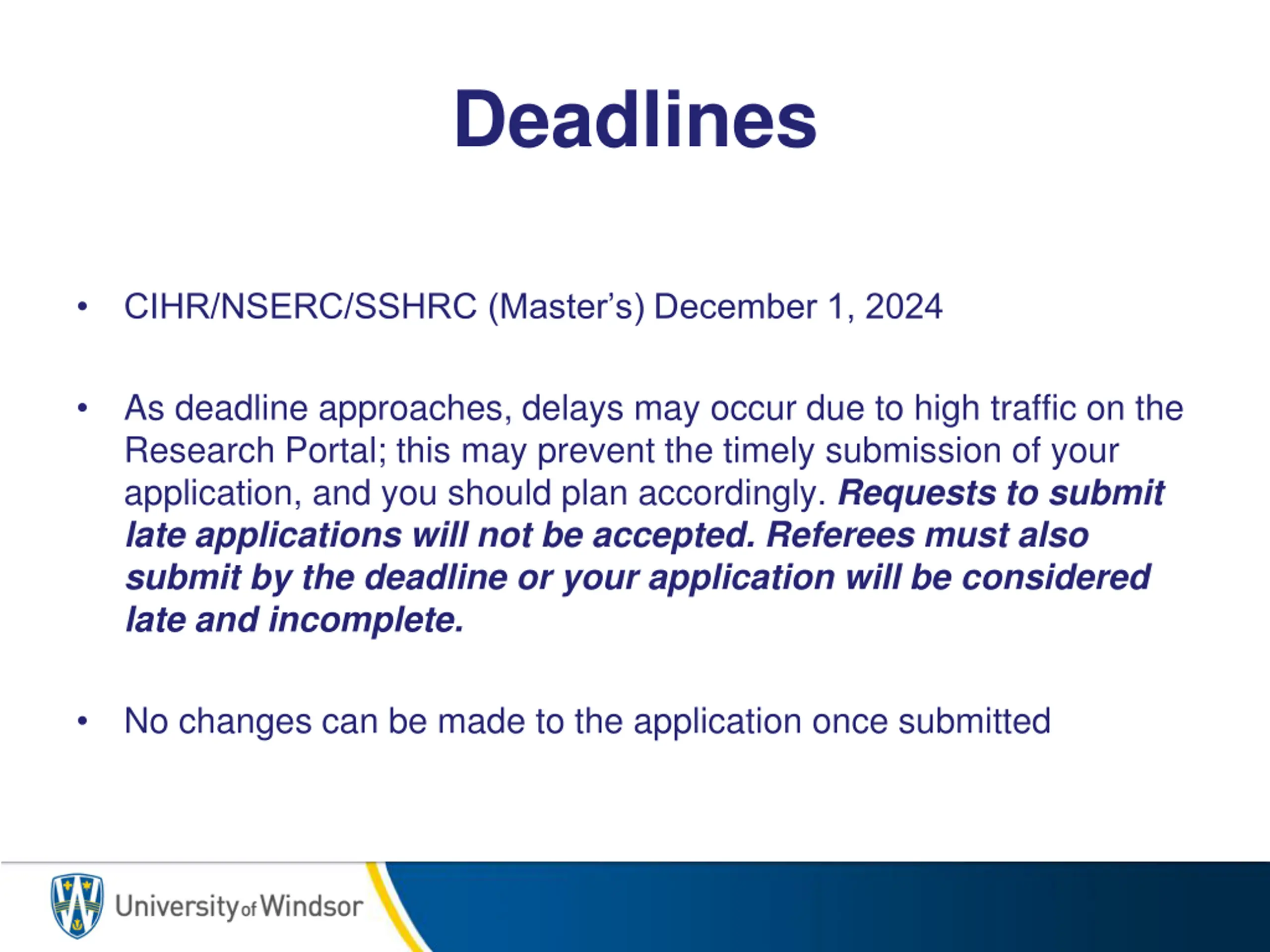Deadlines CIHR/NSERC/SSHRC (Master s) December 1, 2024 As deadline approaches, delays may occur due to high traffic on the Research Portal; this may prevent the timely submission of your application, and you should plan accordingly. Requests to submit late applications will not be accepted. Referees must also submit by the deadline or your application will be considered late and incomplete. No changes can be made to the application once submitted
