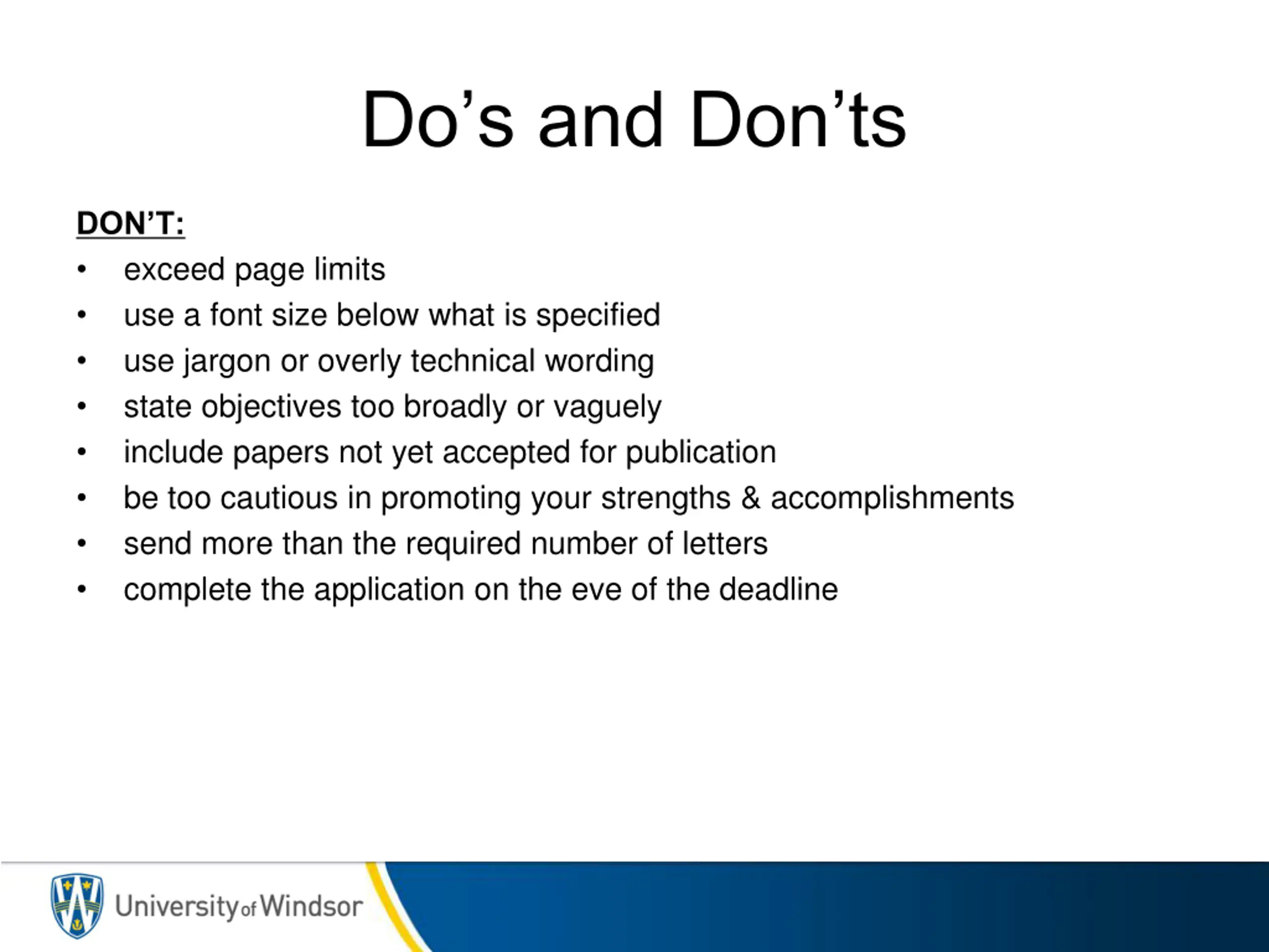 Dos and Donts DON T: exceed page limits use a font size below what is specified use jargon or overly technical wording state objectives too broadly or vaguely include papers not yet accepted for publication be too cautious in promoting your strengths & accomplishments send more than the required number of letters complete the application on the eve of the deadline