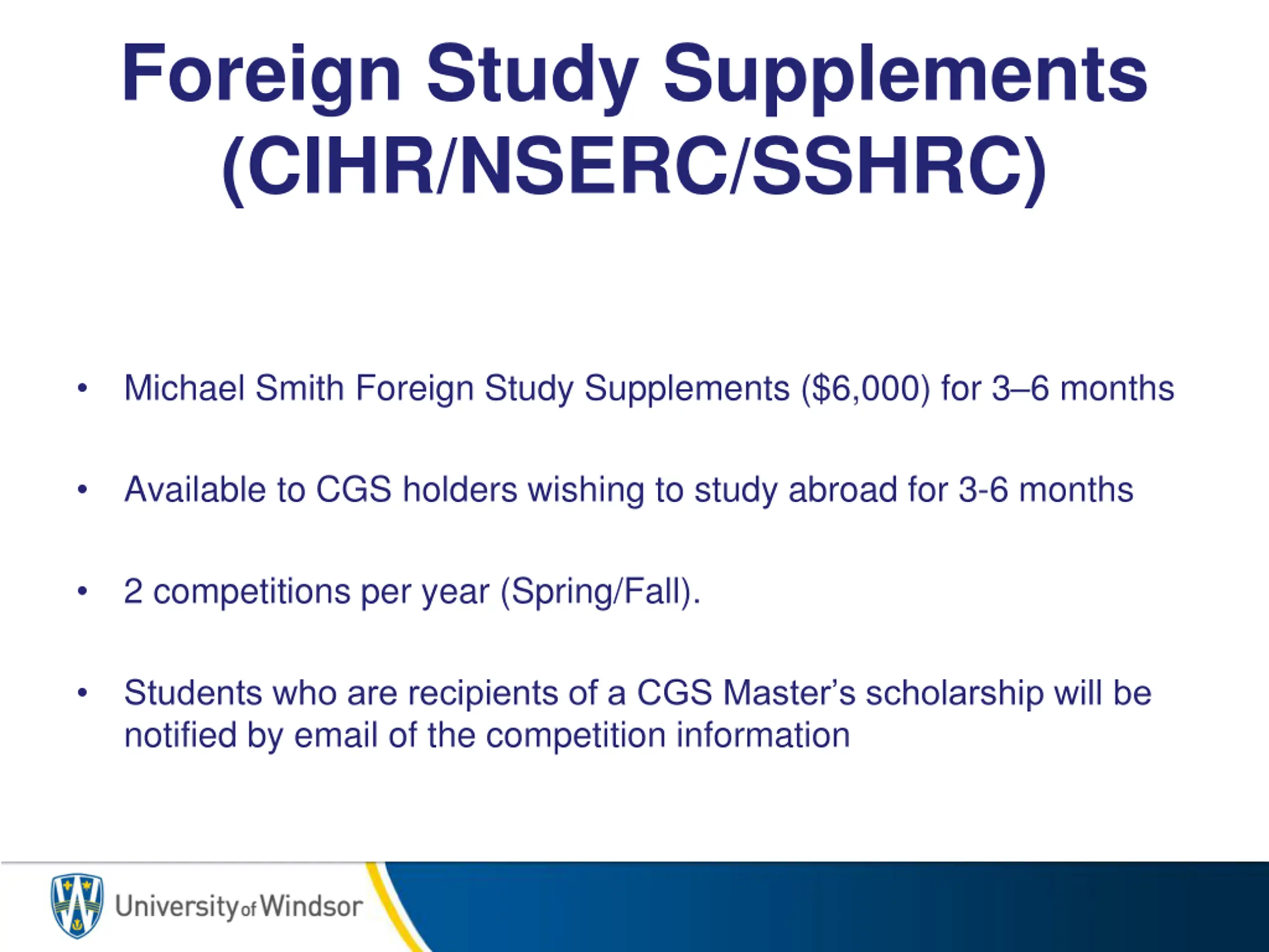 Foreign Study Supplements (CIHR/NSERC/SSHRC) Michael Smith Foreign Study Supplements ($6,000) for 3 6 months Available to CGS holders wishing to study abroad for 3-6 months 2 competitions per year (Spring/Fall). Students who are recipients of a CGS Master s scholarship will be notified by email of the competition information