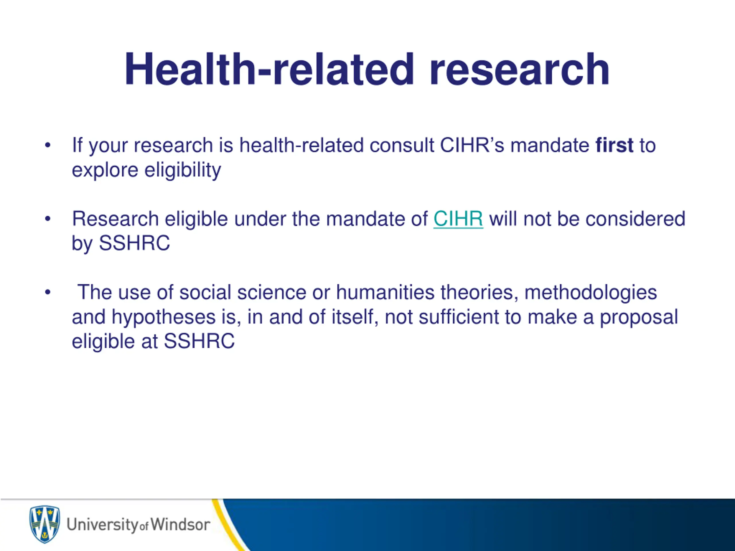 Health-related research If your research is health-related consult CIHR s mandate first to explore eligibility Research eligible under the mandate of CIHR will not be considered by SSHRC The use of social science or humanities theories, methodologies and hypotheses is, in and of itself, not sufficient to make a proposal eligible at SSHRC