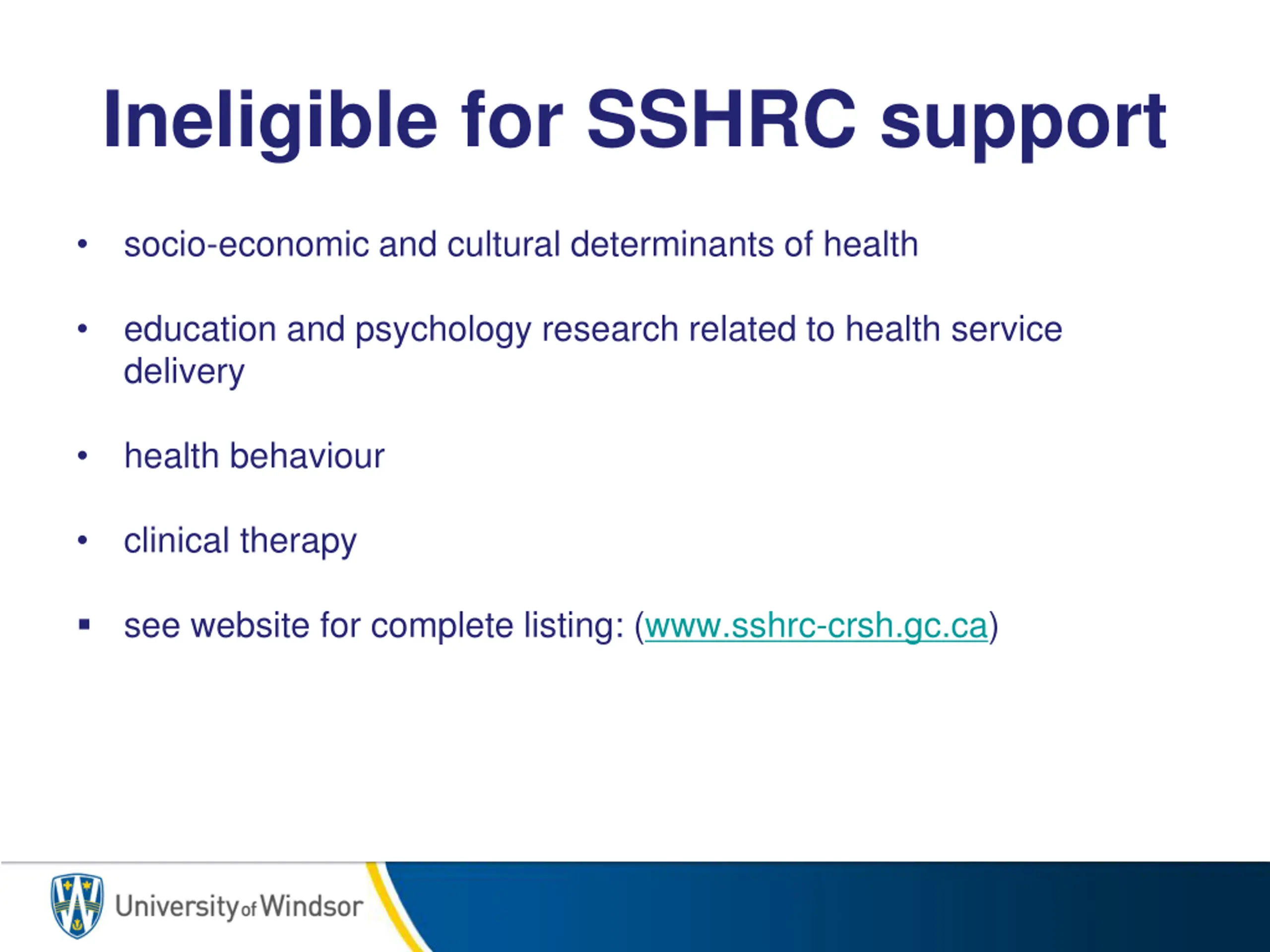 Ineligible for SSHRC support socio-economic and cultural determinants of health education and psychology research related to health service delivery health behaviour clinical therapy see website for complete listing: (www.sshrc-crsh.gc.ca)