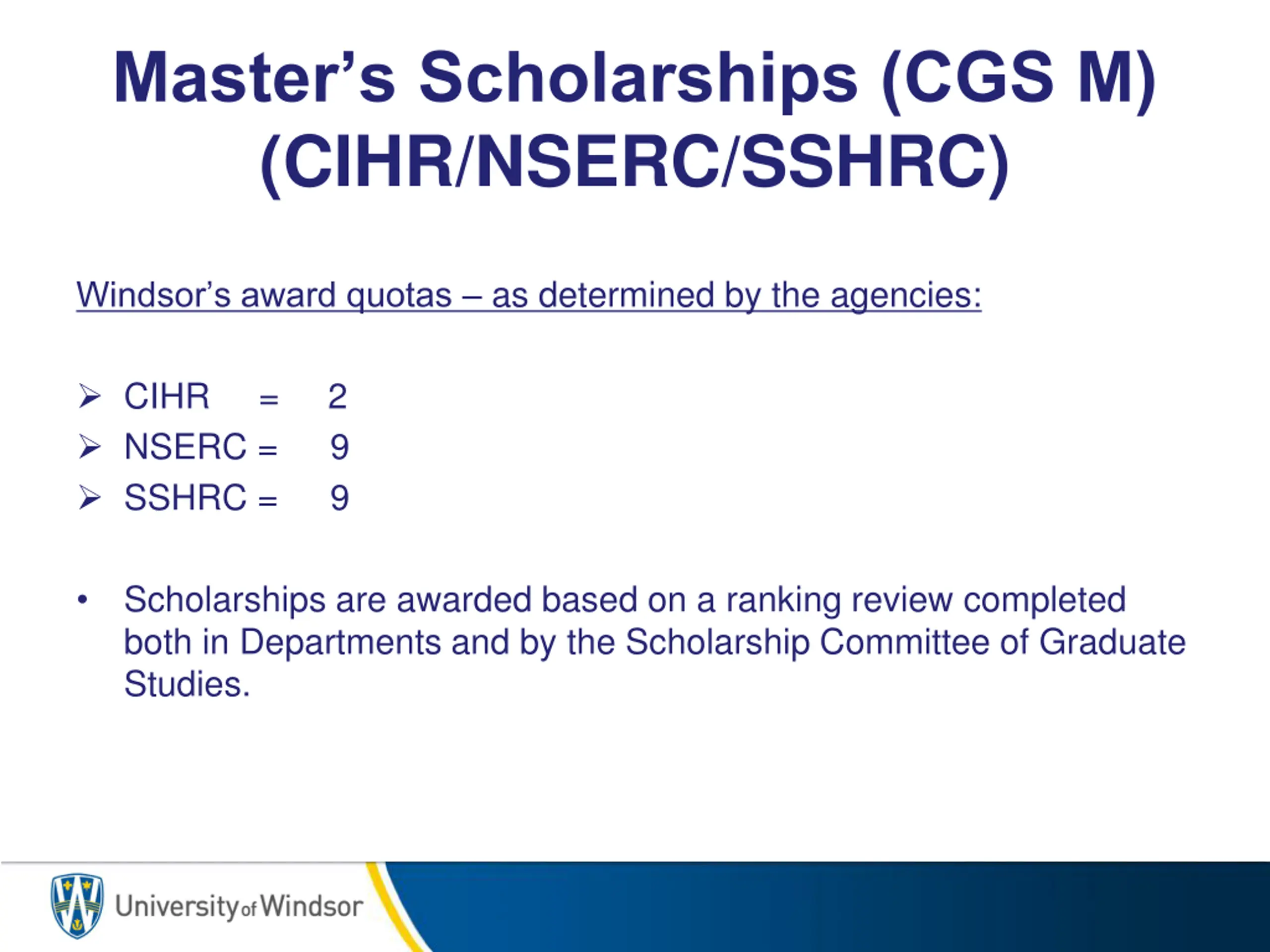 Masters Scholarships (CGS M) (CIHR/NSERC/SSHRC) Windsor s award quotas as determined by the agencies: CIHR = 2 NSERC = SSHRC = 9 9 Scholarships are awarded based on a ranking review completed both in Departments and by the Scholarship Committee of Graduate Studies.