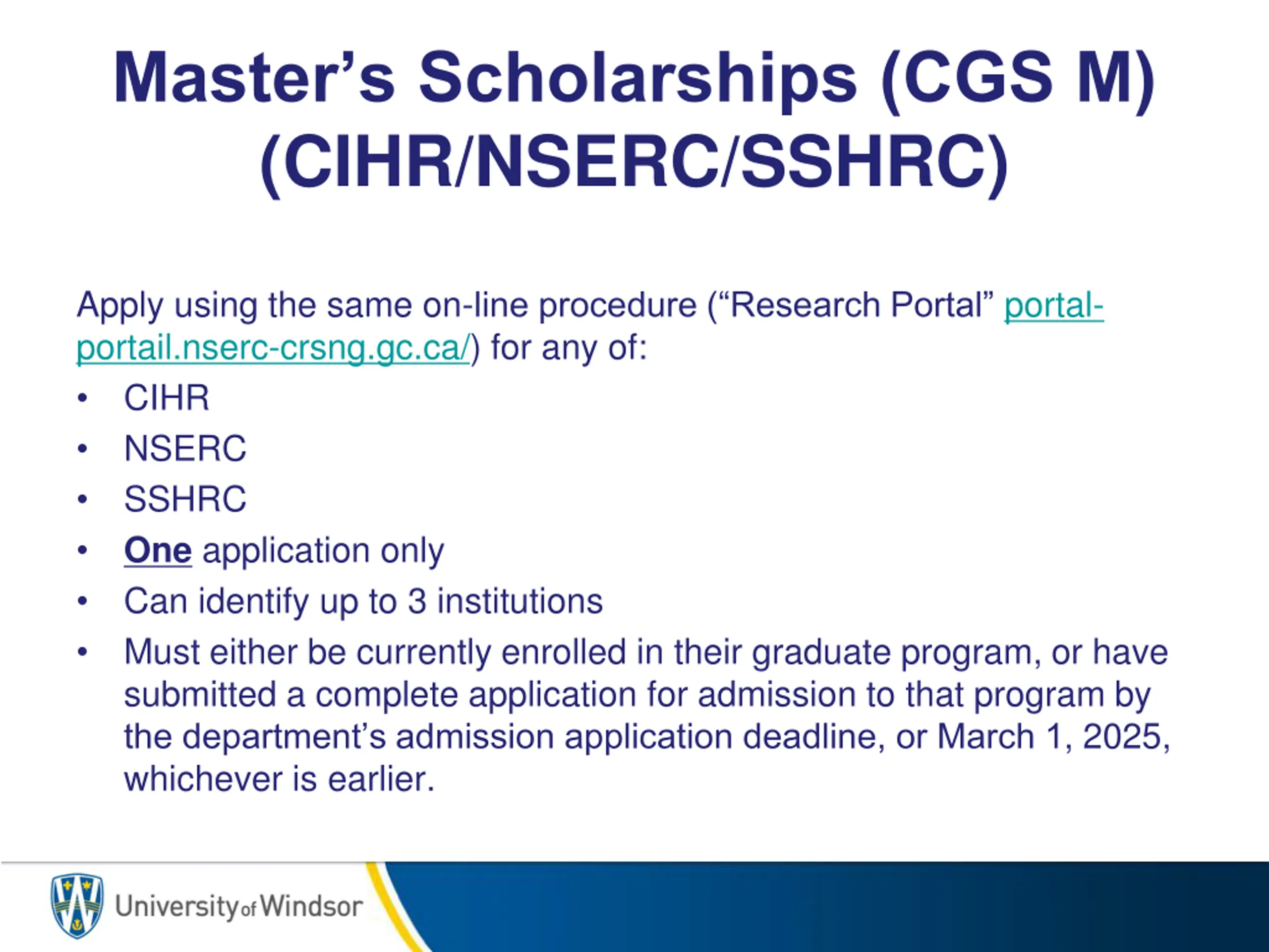 Masters Scholarships (CGS M) (CIHR/NSERC/SSHRC) Apply using the same on-line procedure ( Research Portal portal- portail.nserc-crsng.gc.ca/) for any of: CIHR NSERC SSHRC One application only Can identify up to 3 institutions Must either be currently enrolled in their graduate program, or have submitted a complete application for admission to that program by the department s admission application deadline, or March 1, 2025, whichever is earlier.