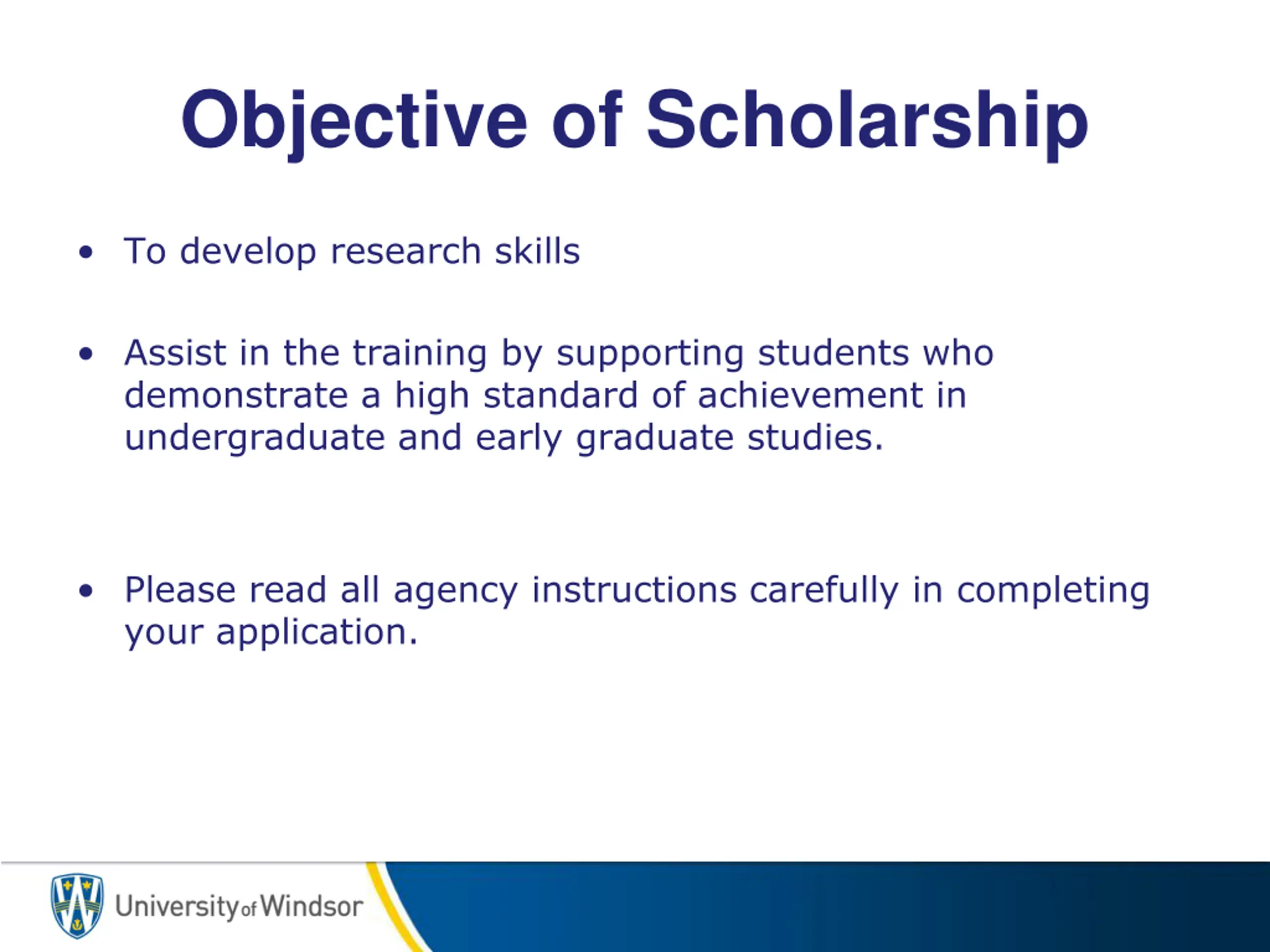 Objective of Scholarship To develop research skills Assist in the training by supporting students who demonstrate a high standard of achievement in undergraduate and early graduate studies. Please read all agency instructions carefully in completing your application.