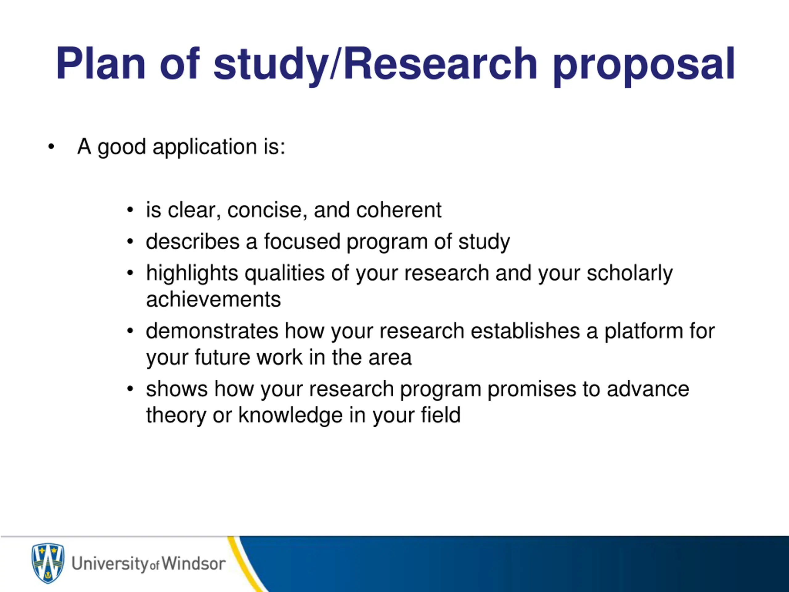 Plan of study/Research proposal A good application is: is clear, concise, and coherent describes a focused program of study highlights qualities of your research and your scholarly achievements demonstrates how your research establishes a platform for your future work in the area shows how your research program promises to advance theory or knowledge in your field