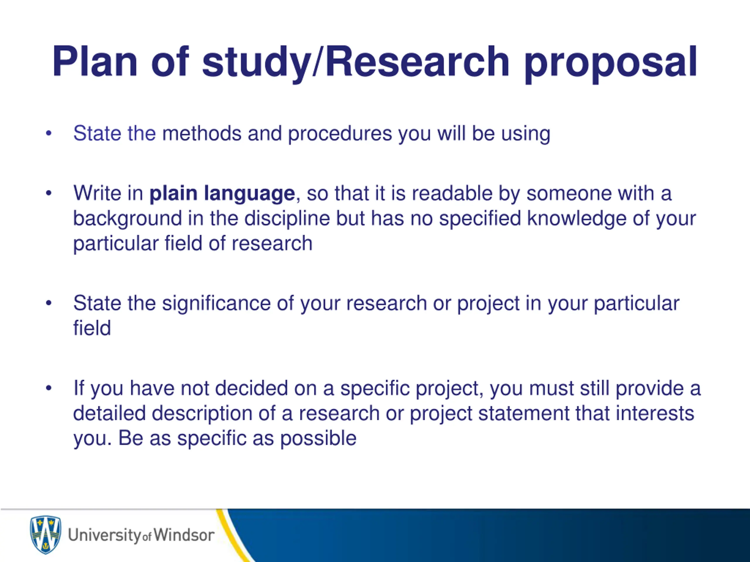 Plan of study/Research proposal State the methods and procedures you will be using Write in plain language, so that it is readable by someone with a background in the discipline but has no specified knowledge of your particular field of research State the significance of your research or project in your particular field If you have not decided on a specific project, you must still provide a detailed description of a research or project statement that interests you. Be as specific as possible