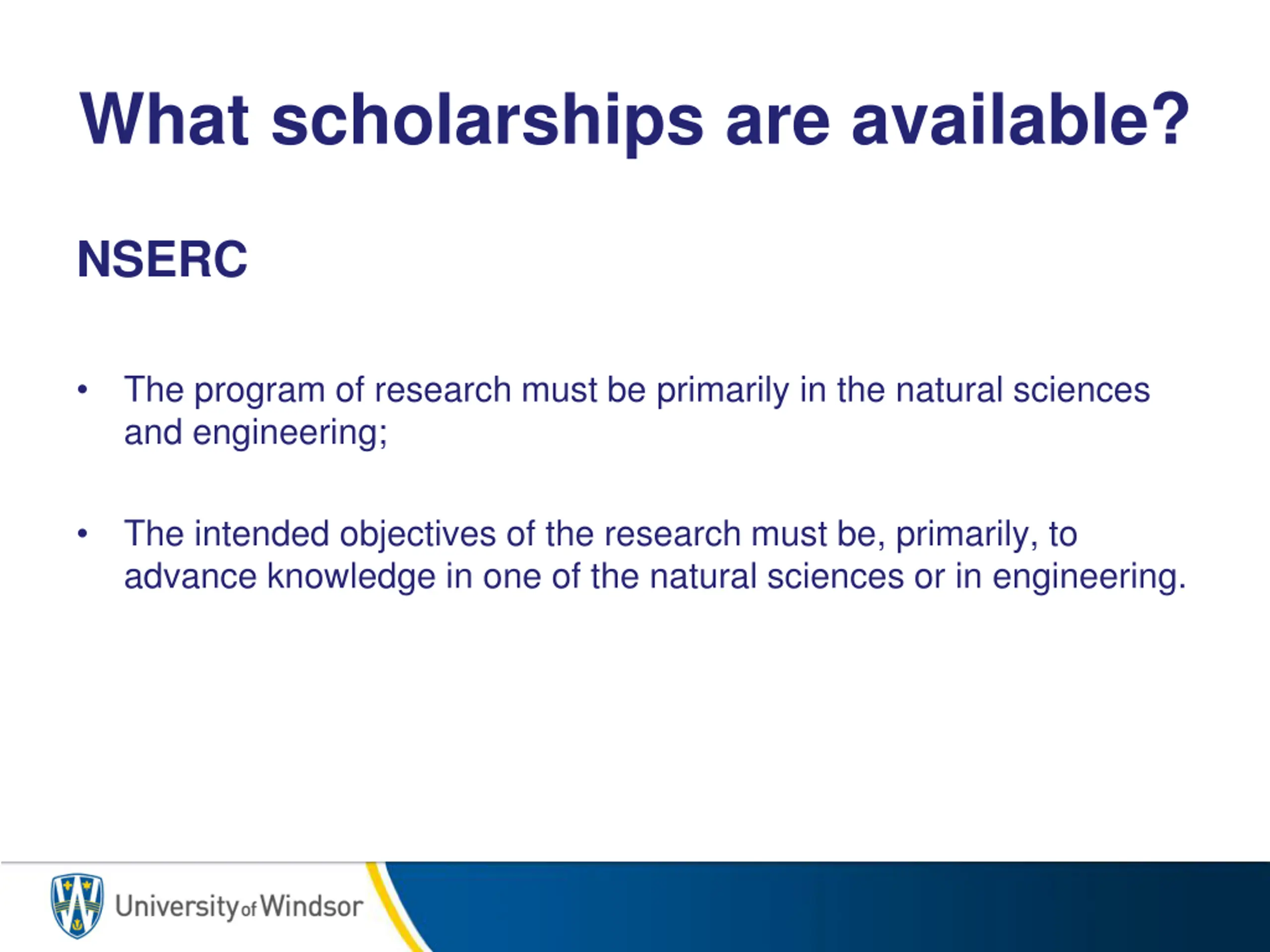 What scholarships are available? NSERC The program of research must be primarily in the natural sciences and engineering; The intended objectives of the research must be, primarily, to advance knowledge in one of the natural sciences or in engineering.