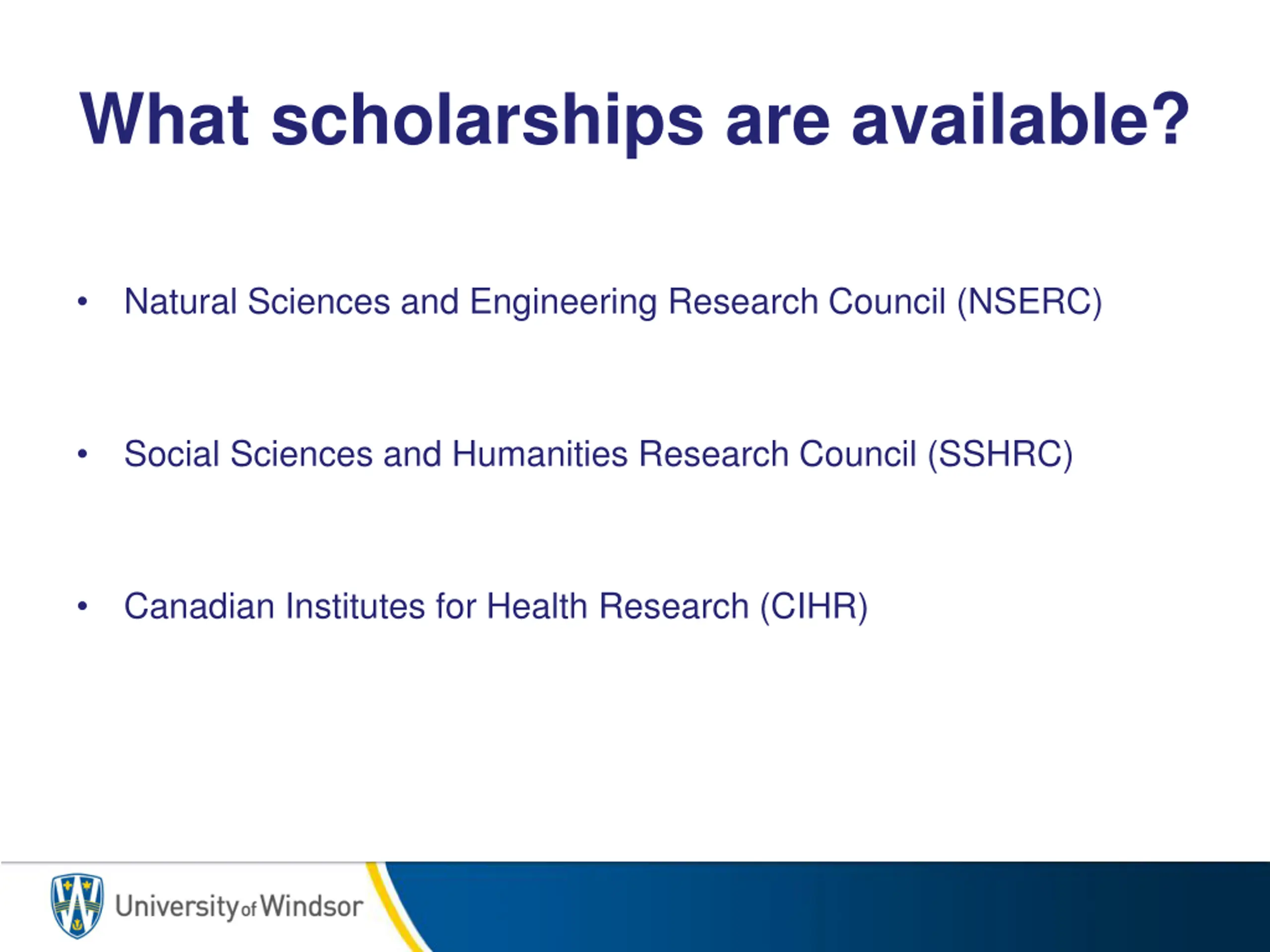 What scholarships are available? Natural Sciences and Engineering Research Council (NSERC) Social Sciences and Humanities Research Council (SSHRC) Canadian Institutes for Health Research (CIHR)