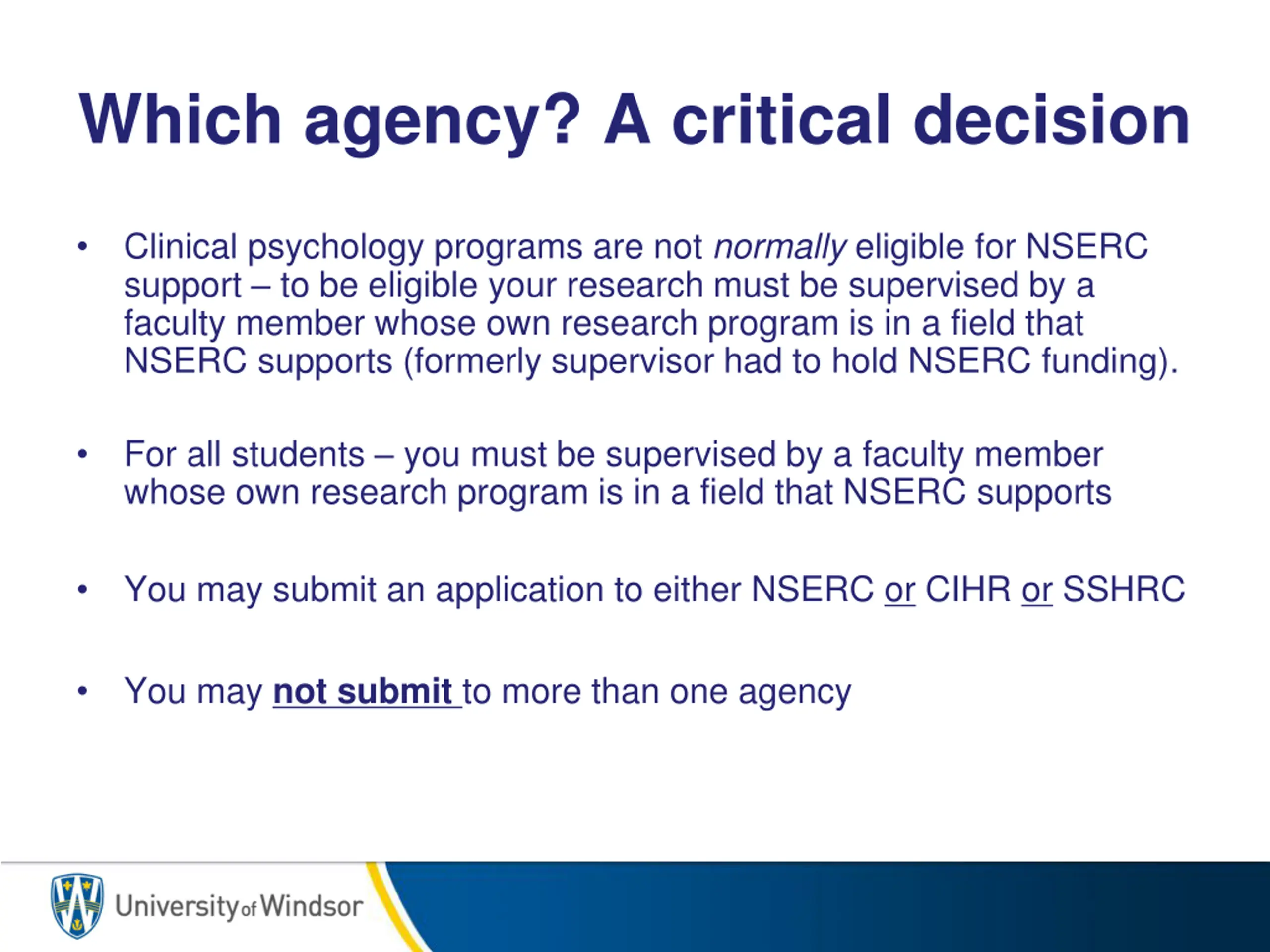 Which agency? A critical decision Clinical psychology programs are not normally eligible for NSERC support to be eligible your research must be supervised by a faculty member whose own research program is in a field that NSERC supports (formerly supervisor had to hold NSERC funding). For all students you must be supervised by a faculty member whose own research program is in a field that NSERC supports You may submit an application to either NSERC or CIHR or SSHRC You may not submit to more than one agency