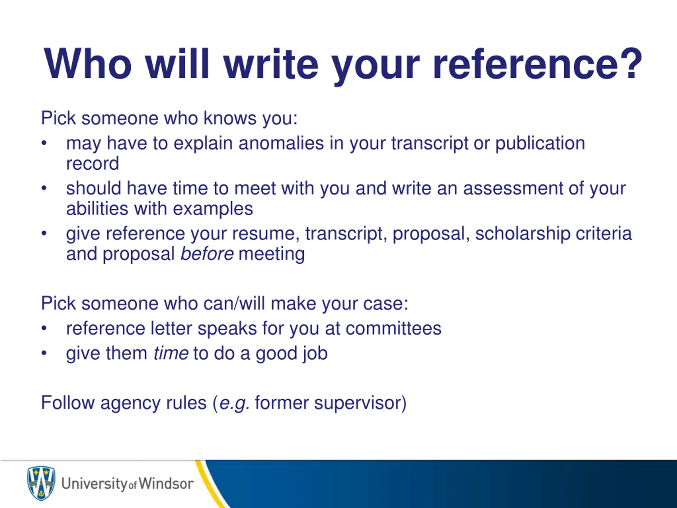 Who will write your reference? Pick someone who knows you: may have to explain anomalies in your transcript or publication record should have time to meet with you and write an assessment of your abilities with examples give reference your resume, transcript, proposal, scholarship criteria and proposal before meeting Pick someone who can/will make your case: reference letter speaks for you at committees give them time to do a good job Follow agency rules (e.g. former supervisor)