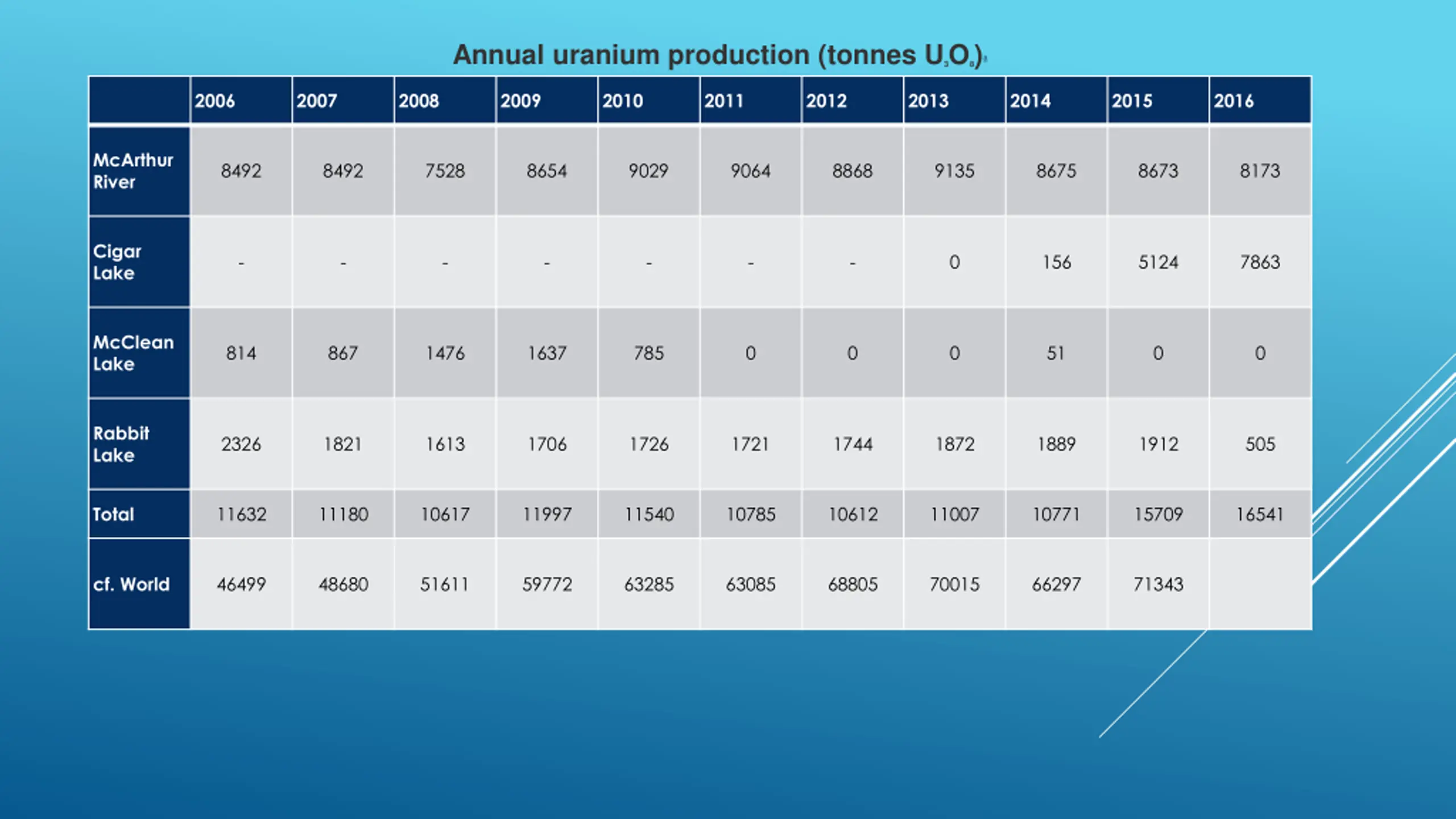 Annual uranium production (tonnes U3O8)a 2006 2007 2008 2009 2010 2011 2012 2013 2014 2015 2016 McArthur River 8492 8492 7528 8654 9029 9064 8868 9135 8675 8673 8173 Cigar Lake - - - - - - - 0 156 5124 7863 McClean Lake 814 867 1476 1637 785 0 0 0 51 0 0 Rabbit Lake 2326 1821 1613 1706 1726 1721 1744 1872 1889 1912 505 Total 11632 11180 10617 11997 11540 10785 10612 11007 10771 15709 16541 cf. World 46499 48680 51611 59772 63285 63085 68805 70015 66297 71343