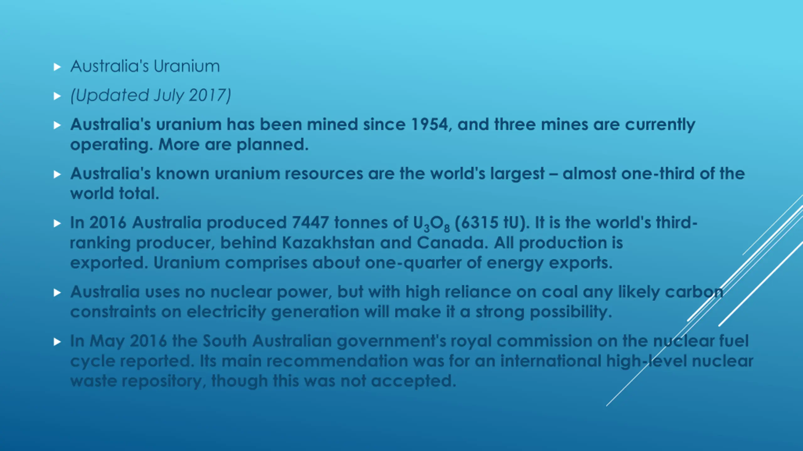 Australia's Uranium (Updated July 2017) Australia's uranium has been mined since 1954, and three mines are currently operating. More are planned. Australia's known uranium resources are the world's largest almost one-third of the world total. In 2016 Australia produced 7447 tonnes of U3O8(6315 tU). It is the world's third- ranking producer, behind Kazakhstan and Canada. All production is exported. Uranium comprises about one-quarter of energy exports. Australia uses no nuclear power, but with high reliance on coal any likely carbon constraints on electricity generation will make it a strong possibility. In May 2016 the South Australian government's royal commission on the nuclear fuel cycle reported. Its main recommendation was for an international high-level nuclear waste repository, though this was not accepted.
