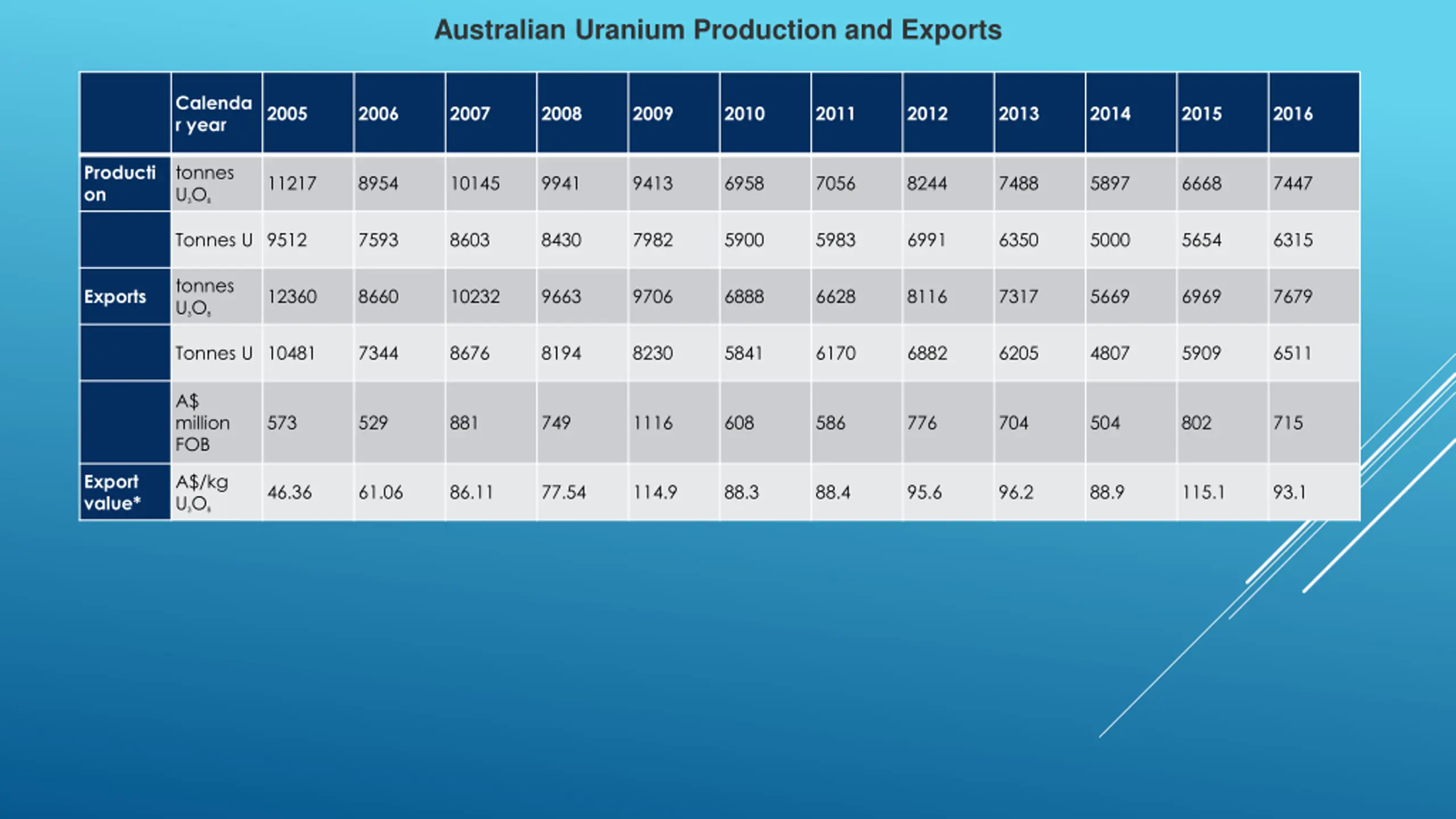 Australian Uranium Production and Exports Calenda r year 2005 2006 2007 2008 2009 2010 2011 2012 2013 2014 2015 2016 Producti on tonnes U3O8 11217 8954 10145 9941 9413 6958 7056 8244 7488 5897 6668 7447 Tonnes U 9512 7593 8603 8430 7982 5900 5983 6991 6350 5000 5654 6315 tonnes U3O8 Exports 12360 8660 10232 9663 9706 6888 6628 8116 7317 5669 6969 7679 Tonnes U 10481 7344 8676 8194 8230 5841 6170 6882 6205 4807 5909 6511 A$ million FOB 573 529 881 749 1116 608 586 776 704 504 802 715 Export value* A$/kg U3O8 46.36 61.06 86.11 77.54 114.9 88.3 88.4 95.6 96.2 88.9 115.1 93.1
