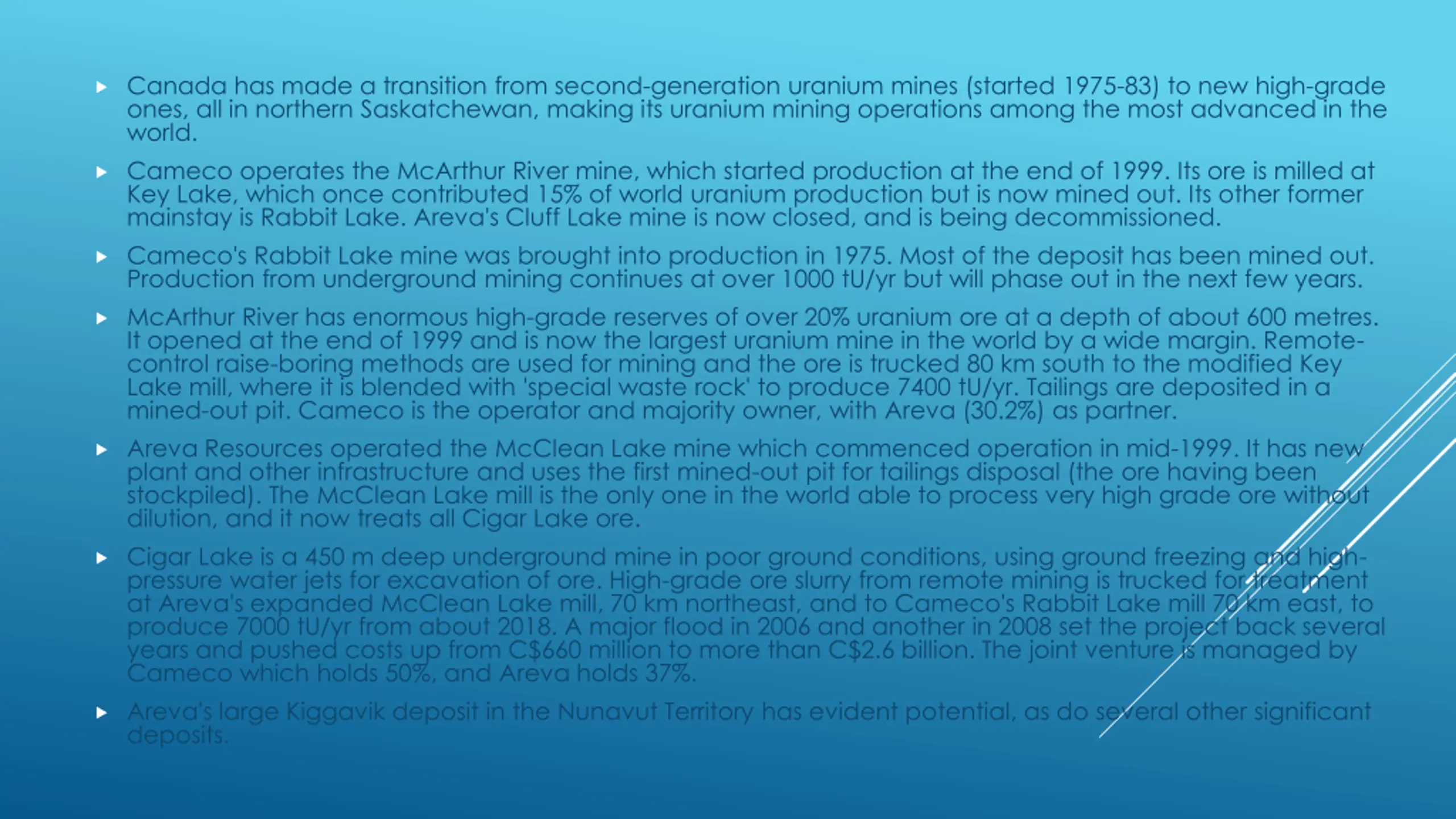 Canada has made a transition from second-generation uranium mines (started 1975-83) to new high-grade ones, all in northern Saskatchewan, making its uranium mining operations among the most advanced in the world. Cameco operates the McArthur River mine, which started production at the end of 1999. Its ore is milled at Key Lake, which once contributed 15% of world uranium production but is now mined out. Its other former mainstay is Rabbit Lake. Areva's Cluff Lake mine is now closed, and is being decommissioned. Cameco's Rabbit Lake mine was brought into production in 1975. Most of the deposit has been mined out. Production from underground mining continues at over 1000 tU/yr but will phase out in the next few years. McArthur River has enormous high-grade reserves of over 20% uranium ore at a depth of about 600 metres. It opened at the end of 1999 and is now the largest uranium mine in the world by a wide margin. Remote- control raise-boring methods are used for mining and the ore is trucked 80 km south to the modified Key Lake mill, where it is blended with 'special waste rock' to produce 7400 tU/yr. Tailings are deposited in a mined-out pit. Cameco is the operator and majority owner, with Areva (30.2%) as partner. Areva Resources operated the McClean Lake mine which commenced operation in mid-1999. It has new plant and other infrastructure and uses the first mined-out pit for tailings disposal (the ore having been stockpiled). The McClean Lake mill is the only one in the world able to process very high grade ore without dilution, and it now treats all Cigar Lake ore. Cigar Lake is a 450 m deep underground mine in poor ground conditions, using ground freezing and high- pressure water jets for excavation of ore. High-grade ore slurry from remote mining is trucked for treatment at Areva's expanded McClean Lake mill, 70 km northeast, and to Cameco's Rabbit Lake mill 70 km east, to produce 7000 tU/yr from about 2018. A major flood in 2006 and another in 2008 set the project back several years and pushed costs up from C$660 million to more than C$2.6 billion. The joint venture is managed by Cameco which holds 50%, and Areva holds 37%. Areva's large Kiggavik deposit in the Nunavut Territory has evident potential, as do several other significant deposits.