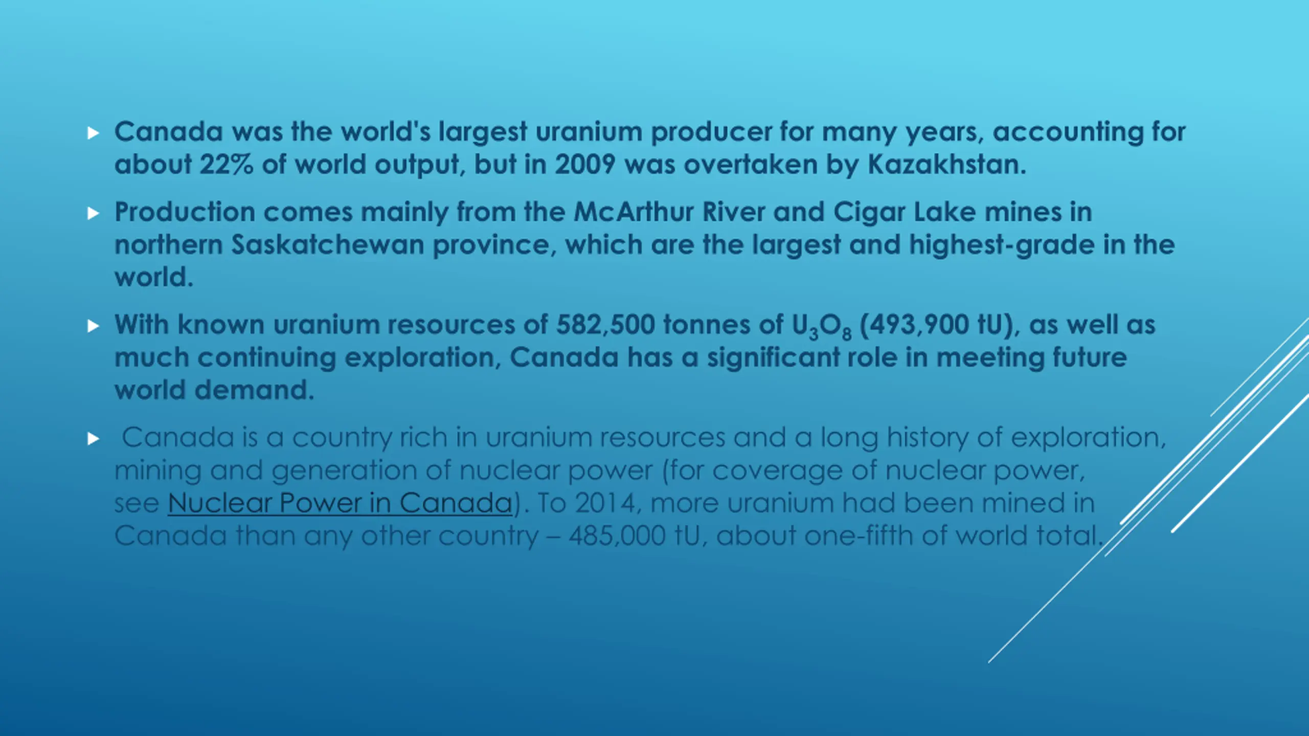 Canada was the world's largest uranium producer for many years, accounting for about 22% of world output, but in 2009 was overtaken by Kazakhstan. Production comes mainly from the McArthur River and Cigar Lake mines in northern Saskatchewan province, which are the largest and highest-grade in the world. With known uranium resources of 582,500 tonnes of U3O8(493,900 tU), as well as much continuing exploration, Canada has a significant role in meeting future world demand. Canada is a country rich in uranium resources and a long history of exploration, mining and generation of nuclear power (for coverage of nuclear power, see Nuclear Power in Canada). To 2014, more uranium had been mined in Canada than any other country 485,000 tU, about one-fifth of world total.