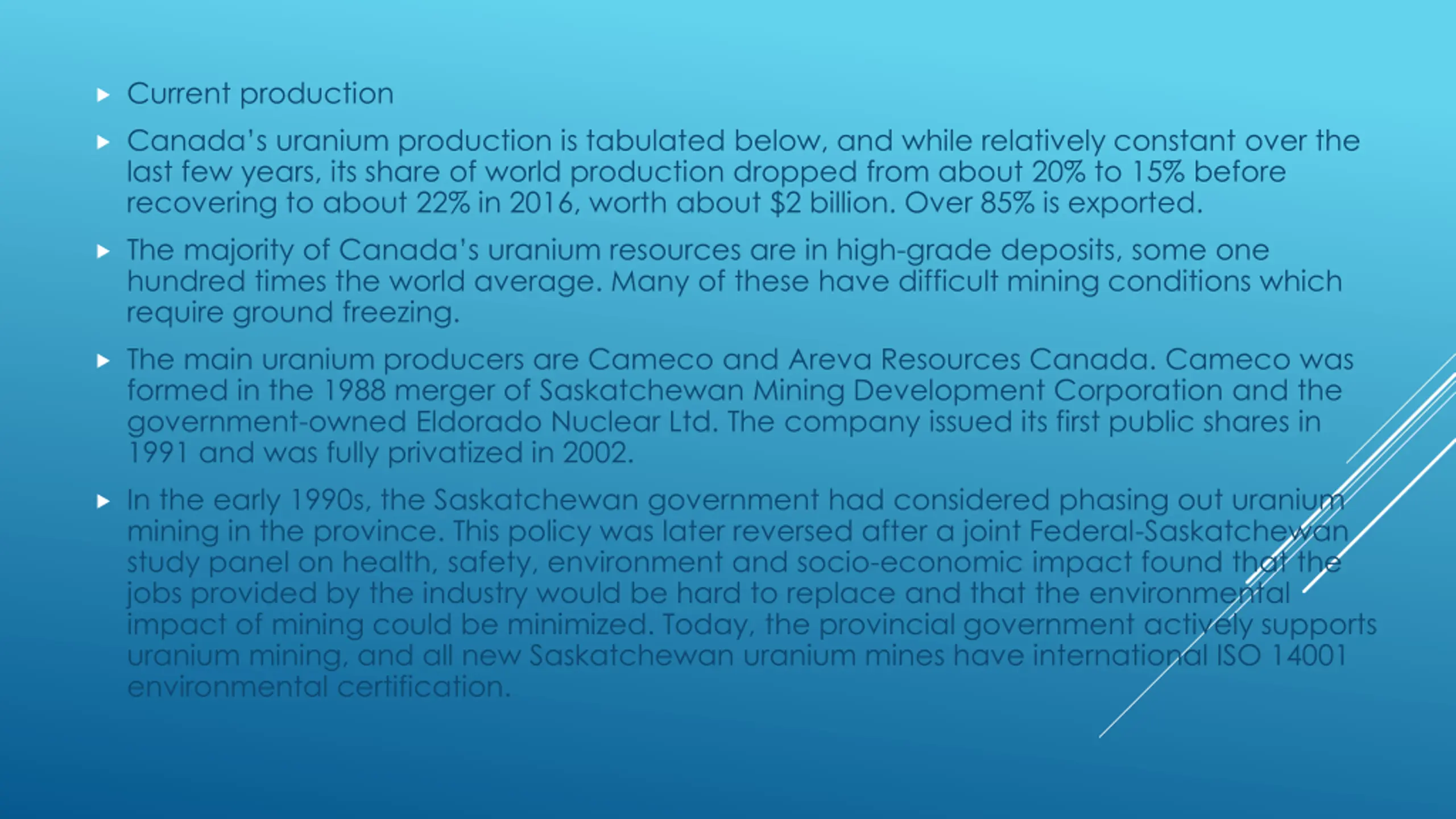 Current production Canada s uranium production is tabulated below, and while relatively constant over the last few years, its share of world production dropped from about 20% to 15% before recovering to about 22% in 2016, worth about $2 billion. Over 85% is exported. The majority of Canada s uranium resources are in high-grade deposits, some one hundred times the world average. Many of these have difficult mining conditions which require ground freezing. The main uranium producers are Cameco and Areva Resources Canada. Cameco was formed in the 1988 merger of Saskatchewan Mining Development Corporation and the government-owned Eldorado Nuclear Ltd. The company issued its first public shares in 1991 and was fully privatized in 2002. In the early 1990s, the Saskatchewan government had considered phasing out uranium mining in the province. This policy was later reversed after a joint Federal-Saskatchewan study panel on health, safety, environment and socio-economic impact found that the jobs provided by the industry would be hard to replace and that the environmental impact of mining could be minimized. Today, the provincial government actively supports uranium mining, and all new Saskatchewan uranium mines have international ISO 14001 environmental certification.