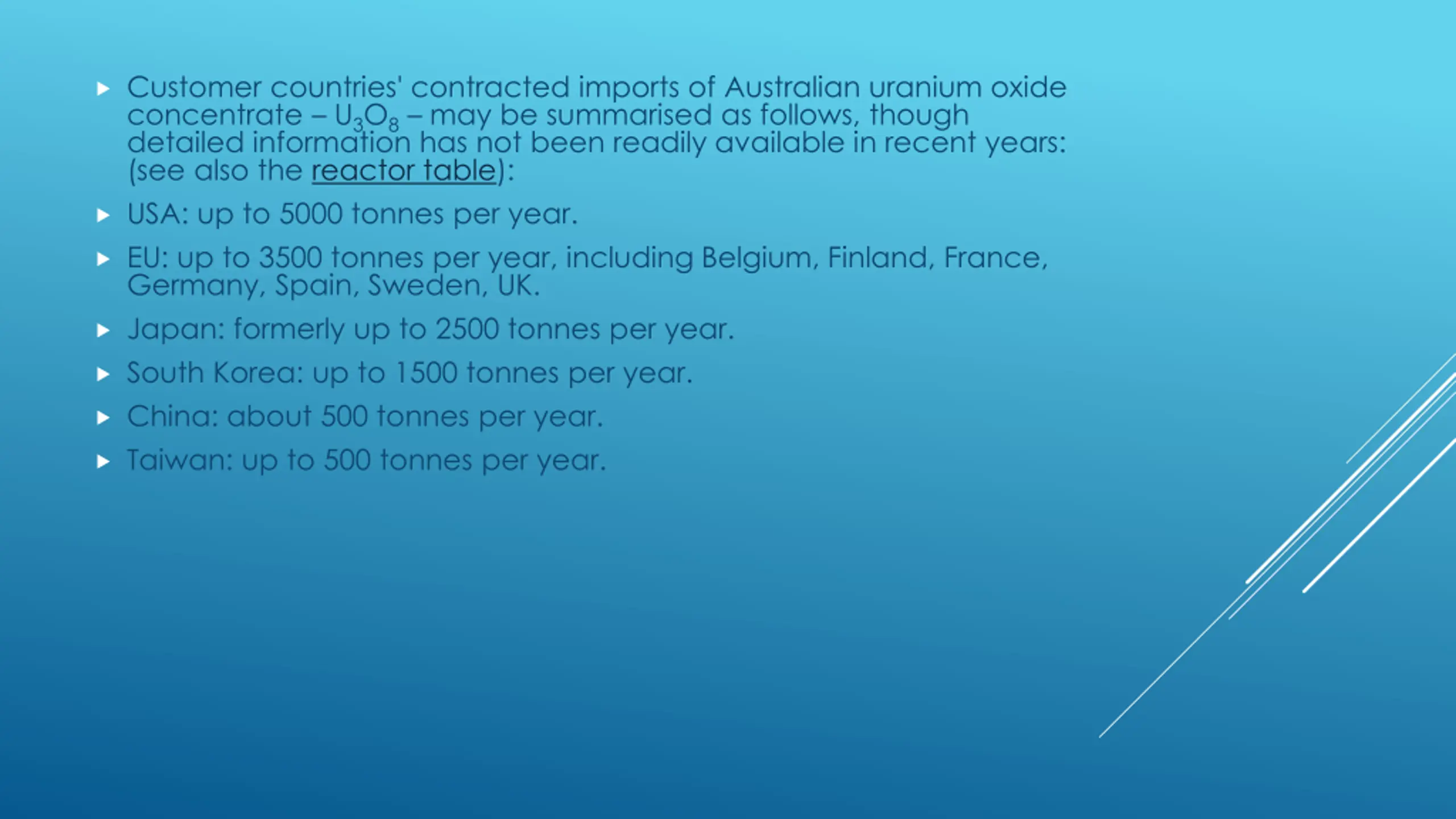Customer countries' contracted imports of Australian uranium oxide concentrate U3O8 may be summarised as follows, though detailed information has not been readily available in recent years: (see also the reactor table): USA: up to 5000 tonnes per year. EU: up to 3500 tonnes per year, including Belgium, Finland, France, Germany, Spain, Sweden, UK. Japan: formerly up to 2500 tonnes per year. South Korea: up to 1500 tonnes per year. China: about 500 tonnes per year. Taiwan: up to 500 tonnes per year.