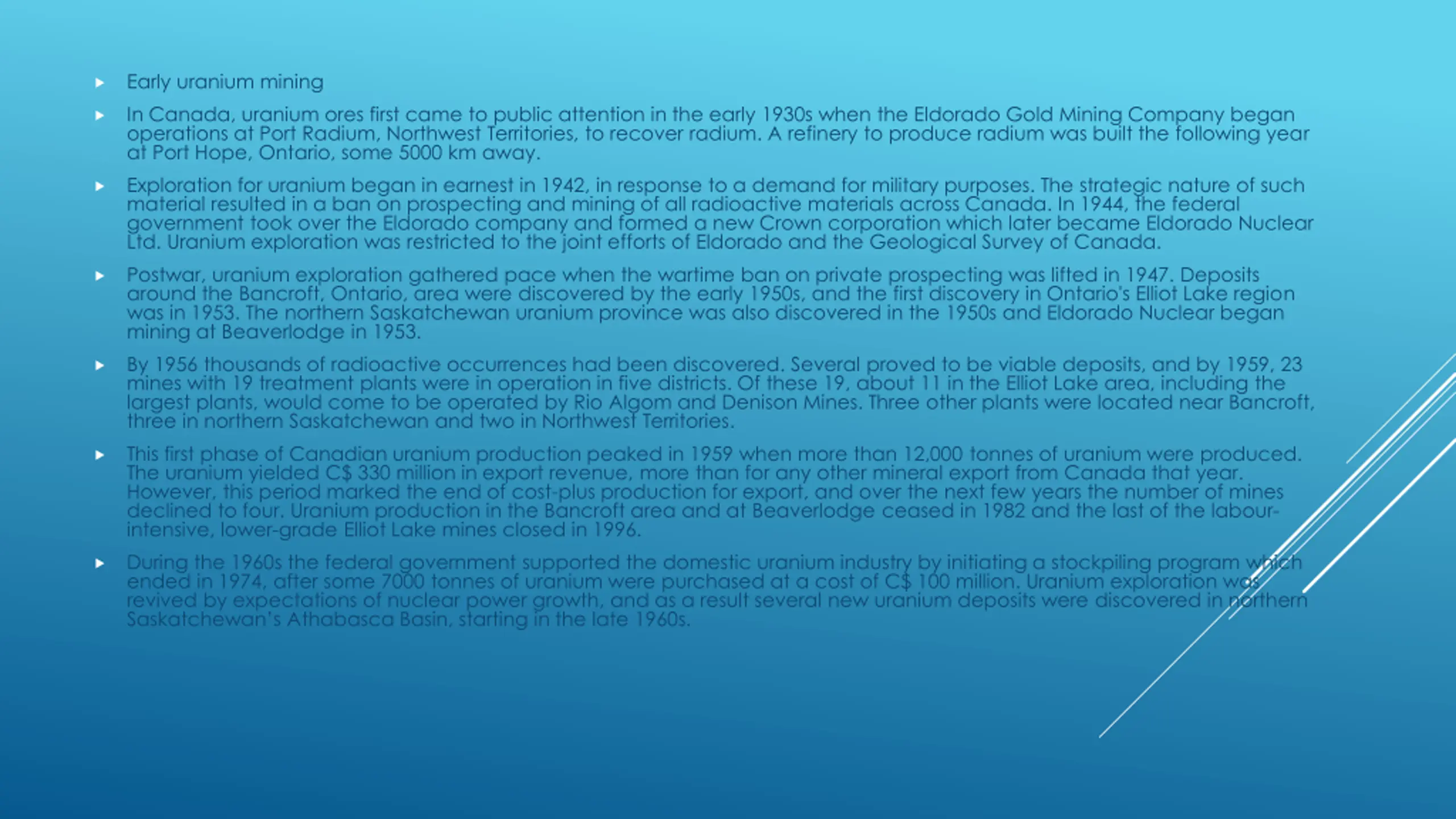 Early uranium mining In Canada, uranium ores first came to public attention in the early 1930s when the Eldorado Gold Mining Company began operations at Port Radium, Northwest Territories, to recover radium. A refinery to produce radium was built the following year at Port Hope, Ontario, some 5000 km away. Exploration for uranium began in earnest in 1942, in response to a demand for military purposes. The strategic nature of such material resulted in a ban on prospecting and mining of all radioactive materials across Canada. In 1944, the federal government took over the Eldorado company and formed a new Crown corporation which later became Eldorado Nuclear Ltd. Uranium exploration was restricted to the joint efforts of Eldorado and the Geological Survey of Canada. Postwar, uranium exploration gathered pace when the wartime ban on private prospecting was lifted in 1947. Deposits around the Bancroft, Ontario, area were discovered by the early 1950s, and the first discovery in Ontario's Elliot Lake region was in 1953. The northern Saskatchewan uranium province was also discovered in the 1950s and Eldorado Nuclear began mining at Beaverlodge in 1953. By 1956 thousands of radioactive occurrences had been discovered. Several proved to be viable deposits, and by 1959, 23 mines with 19 treatment plants were in operation in five districts. Of these 19, about 11 in the Elliot Lake area, including the largest plants, would come to be operated by Rio Algom and Denison Mines. Three other plants were located near Bancroft, three in northern Saskatchewan and two in Northwest Territories. This first phase of Canadian uranium production peaked in 1959 when more than 12,000 tonnes of uranium were produced. The uranium yielded C$ 330 million in export revenue, more than for any other mineral export from Canada that year. However, this period marked the end of cost-plus production for export, and over the next few years the number of mines declined to four. Uranium production in the Bancroft area and at Beaverlodge ceased in 1982 and the last of the labour- intensive, lower-grade Elliot Lake mines closed in 1996. During the 1960s the federal government supported the domestic uranium industry by initiating a stockpiling program which ended in 1974, after some 7000 tonnes of uranium were purchased at a cost of C$ 100 million. Uranium exploration was revived by expectations of nuclear power growth, and as a result several new uranium deposits were discovered in northern Saskatchewan s Athabasca Basin, starting in the late 1960s.