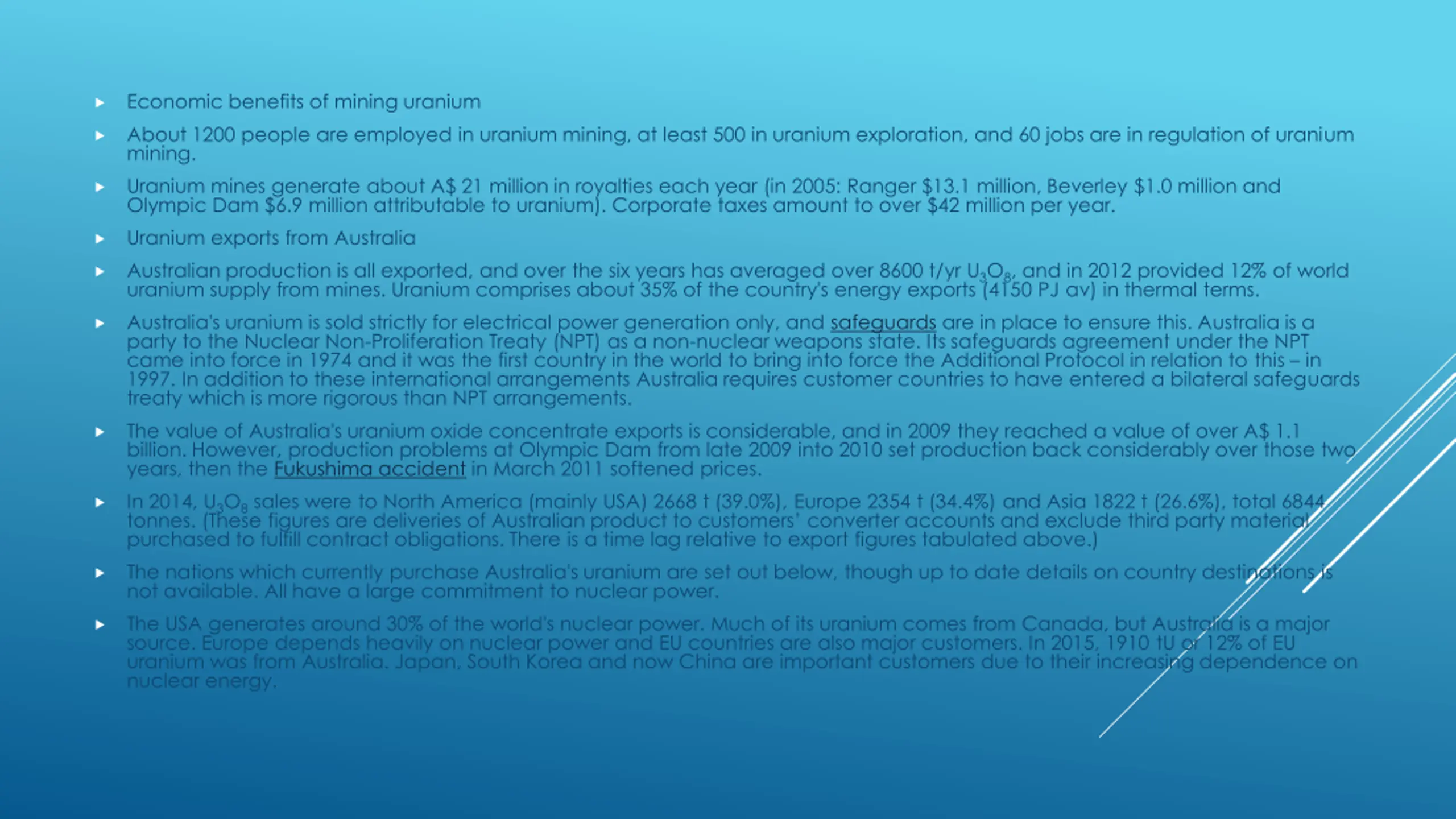 Economic benefits of mining uranium About 1200 people are employed in uranium mining, at least 500 in uranium exploration, and 60 jobs are in regulation of uranium mining. Uranium mines generate about A$ 21 million in royalties each year (in 2005: Ranger $13.1 million, Beverley $1.0 million and Olympic Dam $6.9 million attributable to uranium). Corporate taxes amount to over $42 million per year. Uranium exports from Australia Australian production is all exported, and over the six years has averaged over 8600 t/yr U3O8, and in 2012 provided 12% of world uranium supply from mines. Uranium comprises about 35% of the country's energy exports (4150 PJ av) in thermal terms. Australia's uranium is sold strictly for electrical power generation only, and safeguards are in place to ensure this. Australia is a party to the Nuclear Non-Proliferation Treaty (NPT) as a non-nuclear weapons state. Its safeguards agreement under the NPT came into force in 1974 and it was the first country in the world to bring into force the Additional Protocol in relation to this in 1997. In addition to these international arrangements Australia requires customer countries to have entered a bilateral safeguards treaty which is more rigorous than NPT arrangements. The value of Australia's uranium oxide concentrate exports is considerable, and in 2009 they reached a value of over A$ 1.1 billion. However, production problems at Olympic Dam from late 2009 into 2010 set production back considerably over those two years, then the Fukushima accident in March 2011 softened prices. In 2014, U3O8sales were to North America (mainly USA) 2668 t (39.0%), Europe 2354 t (34.4%) and Asia 1822 t (26.6%), total 6844 tonnes. (These figures are deliveries of Australian product to customers converter accounts and exclude third party material purchased to fulfill contract obligations. There is a time lag relative to export figures tabulated above.) The nations which currently purchase Australia's uranium are set out below, though up to date details on country destinations is not available. All have a large commitment to nuclear power. The USA generates around 30% of the world's nuclear power. Much of its uranium comes from Canada, but Australia is a major source. Europe depends heavily on nuclear power and EU countries are also major customers. In 2015, 1910 tU or 12% of EU uranium was from Australia. Japan, South Korea and now China are important customers due to their increasing dependence on nuclear energy.