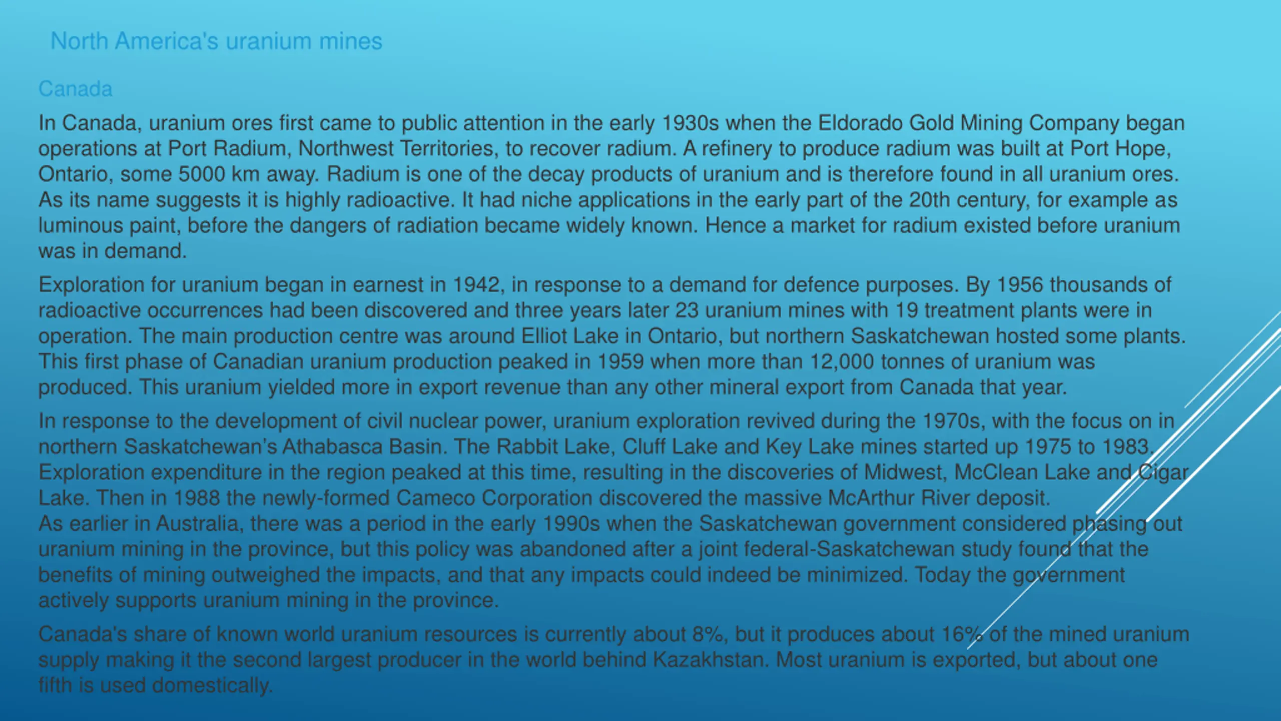 North America's uranium mines Canada In Canada, uranium ores first came to public attention in the early 1930s when the Eldorado Gold Mining Company began operations at Port Radium, Northwest Territories, to recover radium. A refinery to produce radium was built at Port Hope, Ontario, some 5000 km away. Radium is one of the decay products of uranium and is therefore found in all uranium ores. As its name suggests it is highly radioactive. It had niche applications in the early part of the 20th century, for example as luminous paint, before the dangers of radiation became widely known. Hence a market for radium existed before uranium was in demand. Exploration for uranium began in earnest in 1942, in response to a demand for defence purposes. By 1956 thousands of radioactive occurrences had been discovered and three years later 23 uranium mines with 19 treatment plants were in operation. The main production centre was around Elliot Lake in Ontario, but northern Saskatchewan hosted some plants. This first phase of Canadian uranium production peaked in 1959 when more than 12,000 tonnes of uranium was produced. This uranium yielded more in export revenue than any other mineral export from Canada that year. In response to the development of civil nuclear power, uranium exploration revived during the 1970s, with the focus on in northern Saskatchewan s Athabasca Basin. The Rabbit Lake, Cluff Lake and Key Lake mines started up 1975 to 1983. Exploration expenditure in the region peaked at this time, resulting in the discoveries of Midwest, McClean Lake and Cigar Lake. Then in 1988 the newly-formed Cameco Corporation discovered the massive McArthur River deposit. As earlier in Australia, there was a period in the early 1990s when the Saskatchewan government considered phasing out uranium mining in the province, but this policy was abandoned after a joint federal-Saskatchewan study found that the benefits of mining outweighed the impacts, and that any impacts could indeed be minimized. Today the government actively supports uranium mining in the province. Canada's share of known world uranium resources is currently about 8%, but it produces about 16% of the mined uranium supply making it the second largest producer in the world behind Kazakhstan. Most uranium is exported, but about one fifth is used domestically.