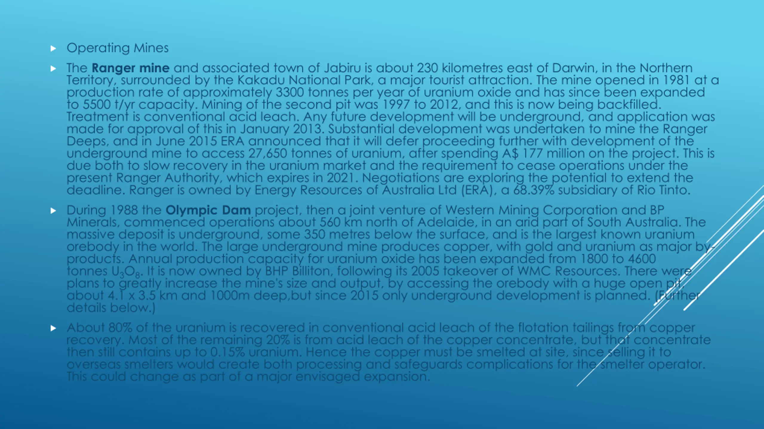 Operating Mines The Ranger mine and associated town of Jabiru is about 230 kilometres east of Darwin, in the Northern Territory, surrounded by the Kakadu National Park, a major tourist attraction. The mine opened in 1981 at a production rate of approximately 3300 tonnes per year of uranium oxide and has since been expanded to 5500 t/yr capacity. Mining of the second pit was 1997 to 2012, and this is now being backfilled. Treatment is conventional acid leach. Any future development will be underground, and application was made for approval of this in January 2013. Substantial development was undertaken to mine the Ranger Deeps, and in June 2015 ERA announced that it will defer proceeding further with development of the underground mine to access 27,650 tonnes of uranium, after spending A$ 177 million on the project. This is due both to slow recovery in the uranium market and the requirement to cease operations under the present Ranger Authority, which expires in 2021. Negotiations are exploring the potential to extend the deadline. Ranger is owned by Energy Resources of Australia Ltd (ERA), a 68.39% subsidiary of Rio Tinto. During 1988 the Olympic Dam project, then a joint venture of Western Mining Corporation and BP Minerals, commenced operations about 560 km north of Adelaide, in an arid part of South Australia. The massive deposit is underground, some 350 metres below the surface, and is the largest known uranium orebody in the world. The large underground mine produces copper, with gold and uranium as major by- products. Annual production capacity for uranium oxide has been expanded from 1800 to 4600 tonnes U3O8. It is now owned by BHP Billiton, following its 2005 takeover of WMC Resources. There were plans to greatly increase the mine's size and output, by accessing the orebody with a huge open pit, about 4.1 x 3.5 km and 1000m deep,but since 2015 only underground development is planned. (Further details below.) About 80% of the uranium is recovered in conventional acid leach of the flotation tailings from copper recovery. Most of the remaining 20% is from acid leach of the copper concentrate, but that concentrate then still contains up to 0.15% uranium. Hence the copper must be smelted at site, since selling it to overseas smelters would create both processing and safeguards complications for the smelter operator. This could change as part of a major envisaged expansion.