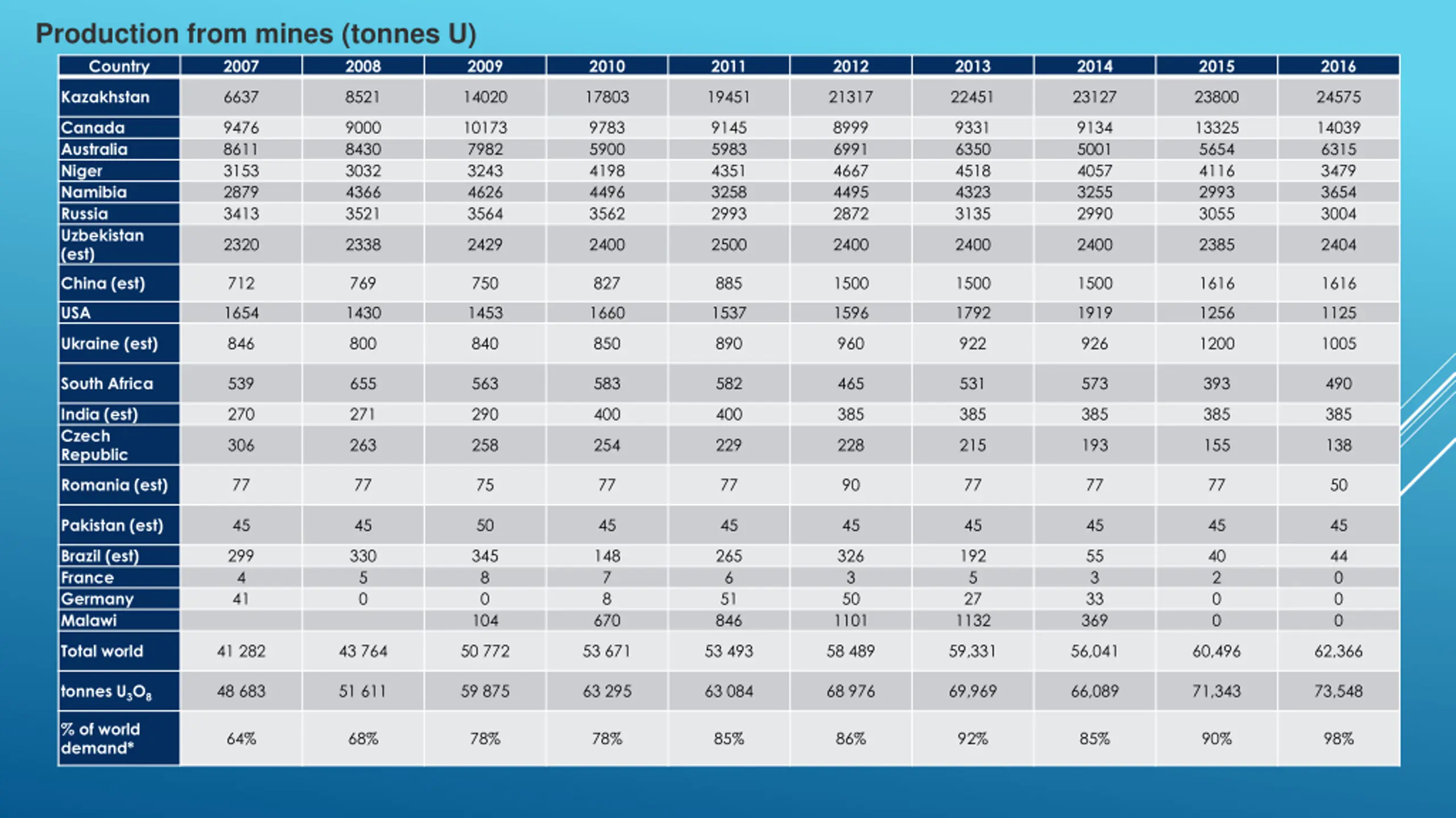 Production from mines (tonnes U) Country 2007 2008 2009 2010 2011 2012 2013 2014 2015 2016 Kazakhstan 6637 8521 14020 17803 19451 21317 22451 23127 23800 24575 Canada Australia Niger Namibia Russia Uzbekistan (est) 9476 8611 3153 2879 3413 9000 8430 3032 4366 3521 10173 7982 3243 4626 3564 9783 5900 4198 4496 3562 9145 5983 4351 3258 2993 8999 6991 4667 4495 2872 9331 6350 4518 4323 3135 9134 5001 4057 3255 2990 13325 5654 4116 2993 3055 14039 6315 3479 3654 3004 2320 2338 2429 2400 2500 2400 2400 2400 2385 2404 China (est) 712 769 750 827 885 1500 1500 1500 1616 1616 USA 1654 1430 1453 1660 1537 1596 1792 1919 1256 1125 Ukraine (est) 846 800 840 850 890 960 922 926 1200 1005 South Africa 539 655 563 583 582 465 531 573 393 490 India (est) Czech Republic 270 271 290 400 400 385 385 385 385 385 306 263 258 254 229 228 215 193 155 138 Romania (est) 77 77 75 77 77 90 77 77 77 50 Pakistan (est) 45 45 50 45 45 45 45 45 45 45 Brazil (est) France Germany Malawi 299 4 41 330 5 0 345 8 0 104 148 7 8 670 265 6 51 846 326 3 50 1101 192 5 27 1132 55 3 33 369 40 2 0 0 44 0 0 0 Total world 41 282 43 764 50 772 53 671 53 493 58 489 59,331 56,041 60,496 62,366 tonnes U3O8 48 683 51 611 59 875 63 295 63 084 68 976 69,969 66,089 71,343 73,548 % of world demand* 64% 68% 78% 78% 85% 86% 92% 85% 90% 98%