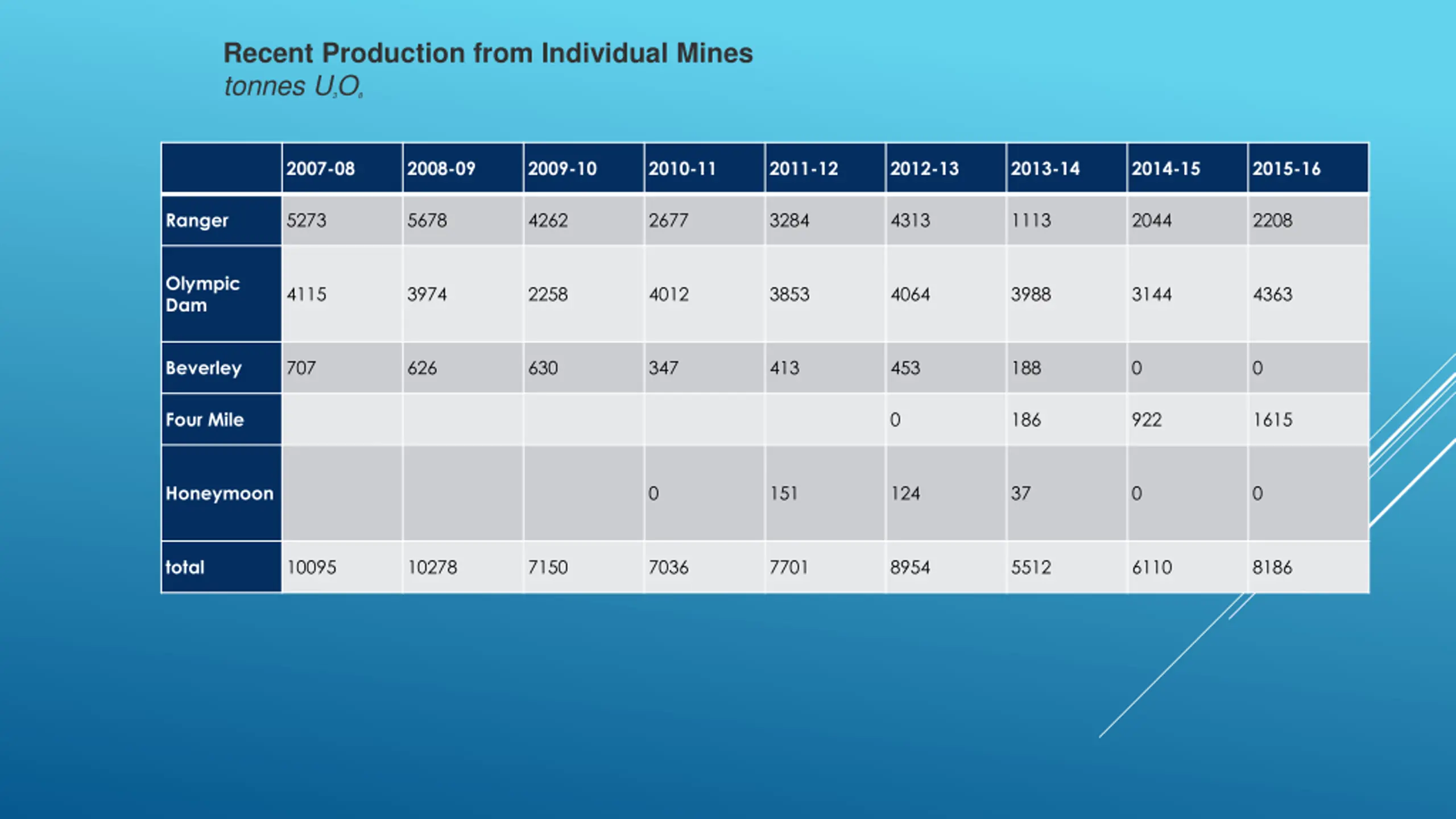 Recent Production from Individual Mines tonnes U3O8 2007-08 2008-09 2009-10 2010-11 2011-12 2012-13 2013-14 2014-15 2015-16 Ranger 5273 5678 4262 2677 3284 4313 1113 2044 2208 Olympic Dam 4115 3974 2258 4012 3853 4064 3988 3144 4363 Beverley 707 626 630 347 413 453 188 0 0 Four Mile 0 186 922 1615 Honeymoon 0 151 124 37 0 0 total 10095 10278 7150 7036 7701 8954 5512 6110 8186