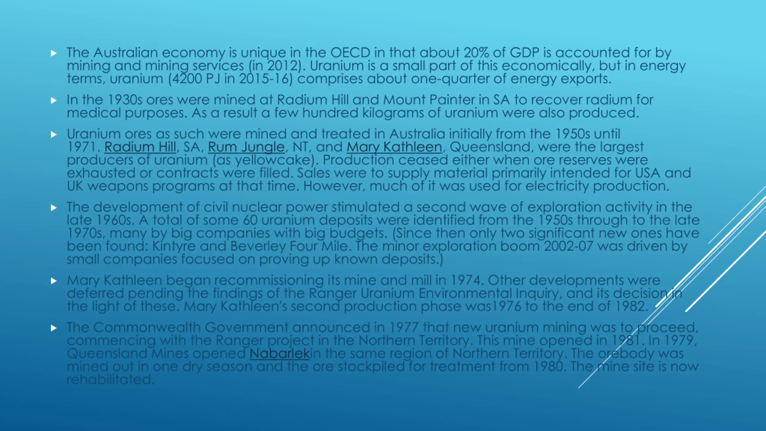 The Australian economy is unique in the OECD in that about 20% of GDP is accounted for by mining and mining services (in 2012). Uranium is a small part of this economically, but in energy terms, uranium (4200 PJ in 2015-16) comprises about one-quarter of energy exports. In the 1930s ores were mined at Radium Hill and Mount Painter in SA to recover radium for medical purposes. As a result a few hundred kilograms of uranium were also produced. Uranium ores as such were mined and treated in Australia initially from the 1950s until 1971. Radium Hill, SA, Rum Jungle, NT, and Mary Kathleen, Queensland, were the largest producers of uranium (as yellowcake). Production ceased either when ore reserves were exhausted or contracts were filled. Sales were to supply material primarily intended for USA and UK weapons programs at that time. However, much of it was used for electricity production. The development of civil nuclear power stimulated a second wave of exploration activity in the late 1960s. A total of some 60 uranium deposits were identified from the 1950s through to the late 1970s, many by big companies with big budgets. (Since then only two significant new ones have been found: Kintyre and Beverley Four Mile. The minor exploration boom 2002-07 was driven by small companies focused on proving up known deposits.) Mary Kathleen began recommissioning its mine and mill in 1974. Other developments were deferred pending the findings of the Ranger Uranium Environmental Inquiry, and its decision in the light of these. Mary Kathleen's second production phase was1976 to the end of 1982. The Commonwealth Government announced in 1977 that new uranium mining was to proceed, commencing with the Ranger project in the Northern Territory. This mine opened in 1981. In 1979, Queensland Mines opened Nabarlekin the same region of Northern Territory. The orebody was mined out in one dry season and the ore stockpiled for treatment from 1980. The mine site is now rehabilitated.