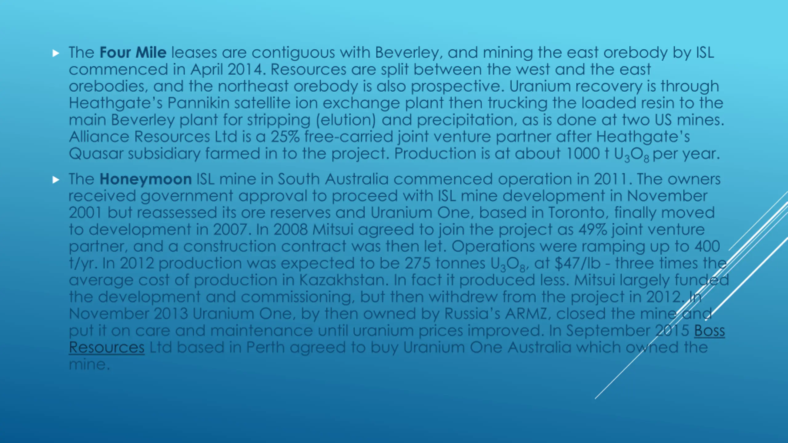 The Four Mile leases are contiguous with Beverley, and mining the east orebody by ISL commenced in April 2014. Resources are split between the west and the east orebodies, and the northeast orebody is also prospective. Uranium recovery is through Heathgate s Pannikin satellite ion exchange plant then trucking the loaded resin to the main Beverley plant for stripping (elution) and precipitation, as is done at two US mines. Alliance Resources Ltd is a 25% free-carried joint venture partner after Heathgate s Quasar subsidiary farmed in to the project. Production is at about 1000 t U3O8per year. The Honeymoon ISL mine in South Australia commenced operation in 2011. The owners received government approval to proceed with ISL mine development in November 2001 but reassessed its ore reserves and Uranium One, based in Toronto, finally moved to development in 2007. In 2008 Mitsui agreed to join the project as 49% joint venture partner, and a construction contract was then let. Operations were ramping up to 400 t/yr. In 2012 production was expected to be 275 tonnes U3O8, at $47/lb - three times the average cost of production in Kazakhstan. In fact it produced less. Mitsui largely funded the development and commissioning, but then withdrew from the project in 2012. In November 2013 Uranium One, by then owned by Russia s ARMZ, closed the mine and put it on care and maintenance until uranium prices improved. In September 2015 Boss Resources Ltd based in Perth agreed to buy Uranium One Australia which owned the mine.