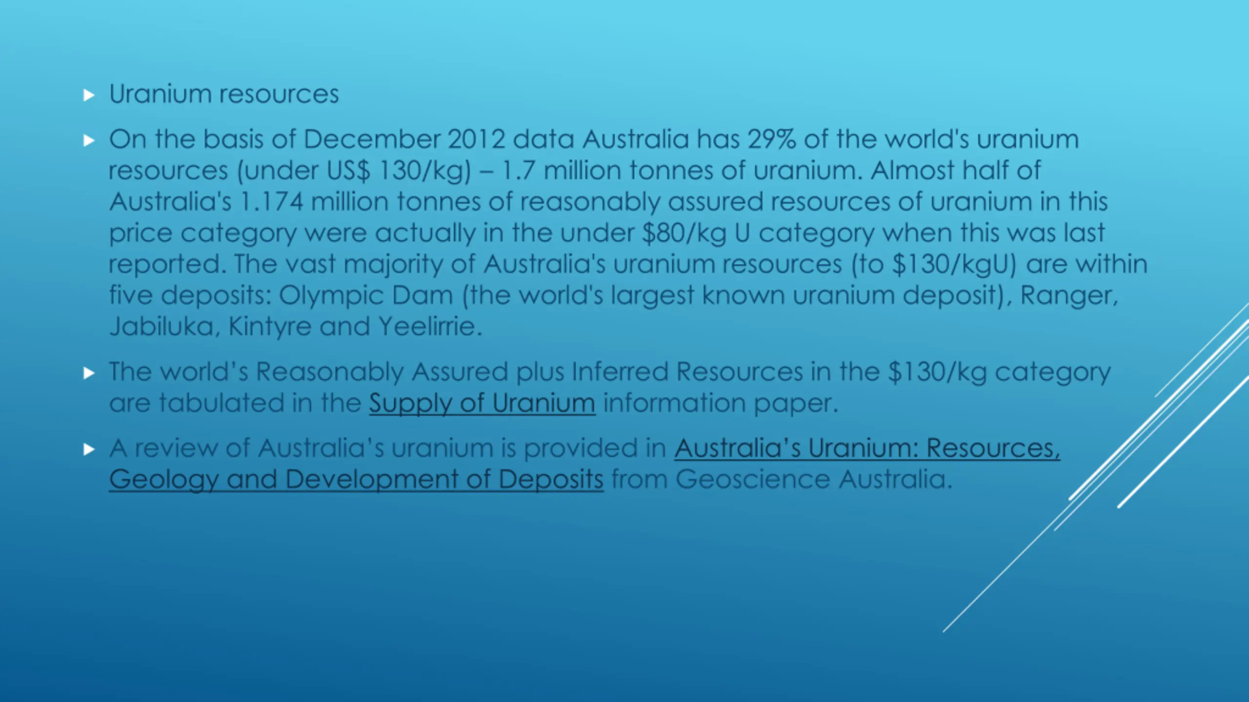 Uranium resources On the basis of December 2012 data Australia has 29% of the world's uranium resources (under US$ 130/kg) 1.7 million tonnes of uranium. Almost half of Australia's 1.174 million tonnes of reasonably assured resources of uranium in this price category were actually in the under $80/kg U category when this was last reported. The vast majority of Australia's uranium resources (to $130/kgU) are within five deposits: Olympic Dam (the world's largest known uranium deposit), Ranger, Jabiluka, Kintyre and Yeelirrie. The world s Reasonably Assured plus Inferred Resources in the $130/kg category are tabulated in the Supply of Uranium information paper. A review of Australia s uranium is provided in Australia s Uranium: Resources, Geology and Development of Deposits from Geoscience Australia.