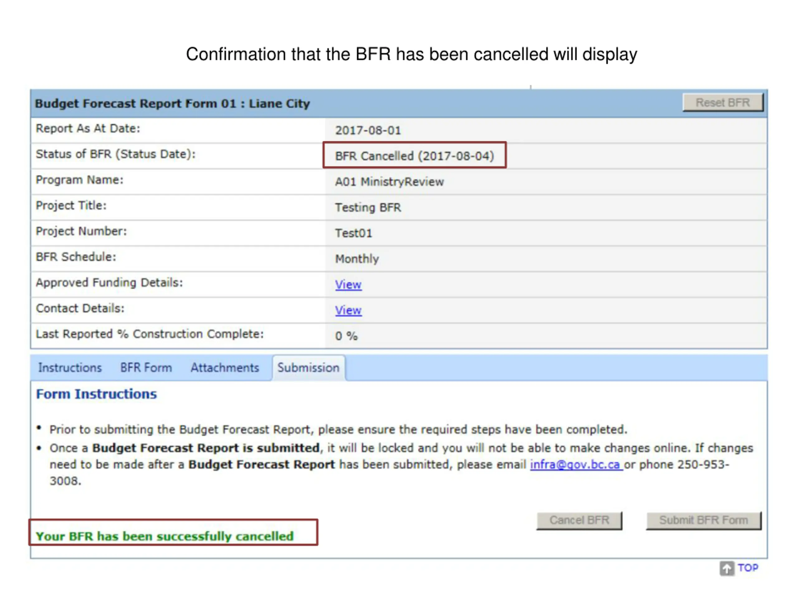 Please Note: Users can only cancel BFRs that are in BFR Incomplete status. Please contact the Ministry if the BFR has been submitted to report a material change in information.