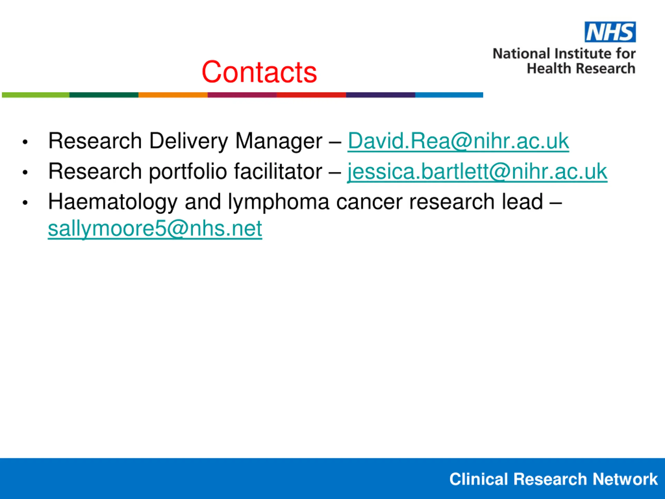 Contacts Research Delivery Manager David.Rea@nihr.ac.uk Research portfolio facilitator jessica.bartlett@nihr.ac.uk Haematology and lymphoma cancer research lead sallymoore5@nhs.net Clinical Research Network