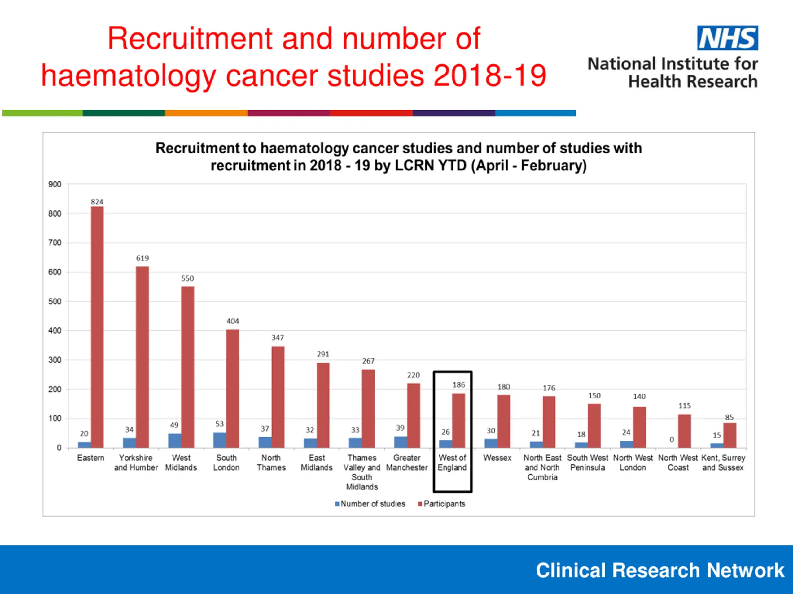 Recruitment and number of haematology cancer studies 2018-19 Clinical Research Network
