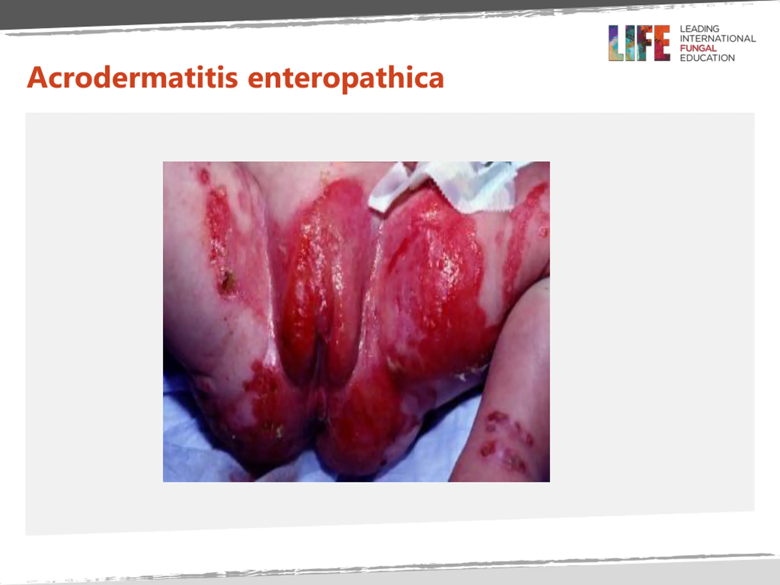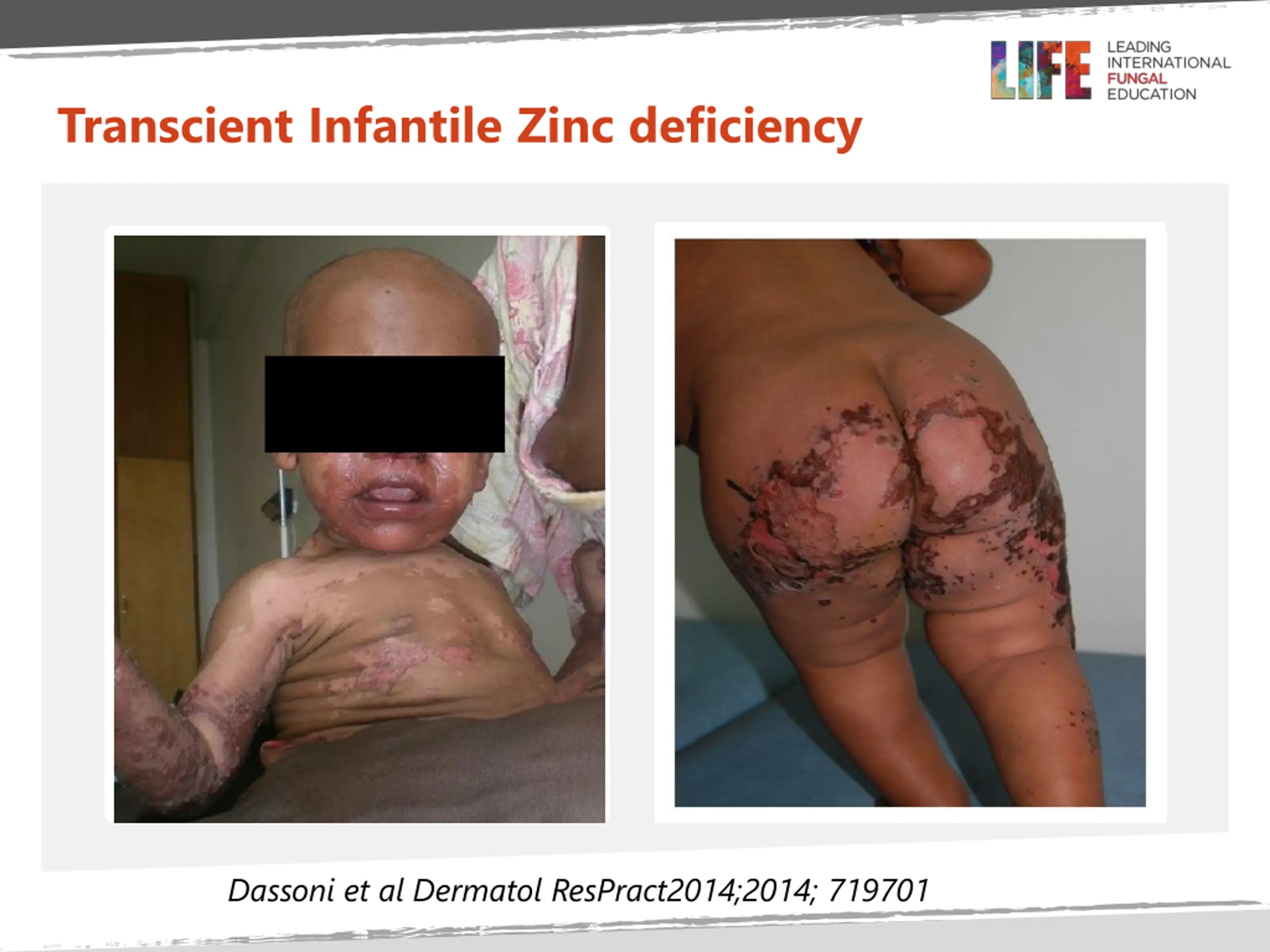 Zinc deficiency Can be Inherited (acrodermatitis enteropathica-rare) or acquired. Presentation is similar when deficiency is severe perioroficial dermatitis Young infants are at higher risk of deficiency due to increased demand during growth. In young infants, dietary constraints such as delayed complimentary feeding and feeds high in phytate content also increase likelihood of defiency