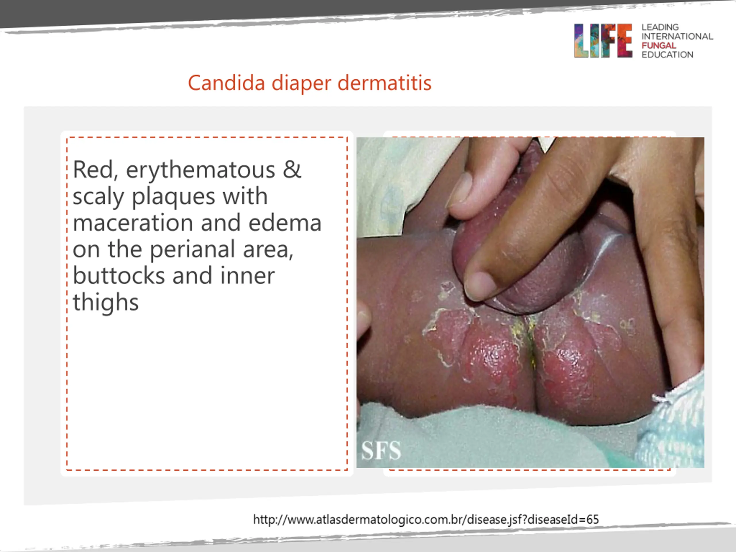 Candida diaper dermatitis Red, erythematous & scaly plaques with maceration and edema on the perianal area, buttocks, lower abdomen, and inner thighs http://www.atlasdermatologico.com.br/disease.jsf?diseaseId=65